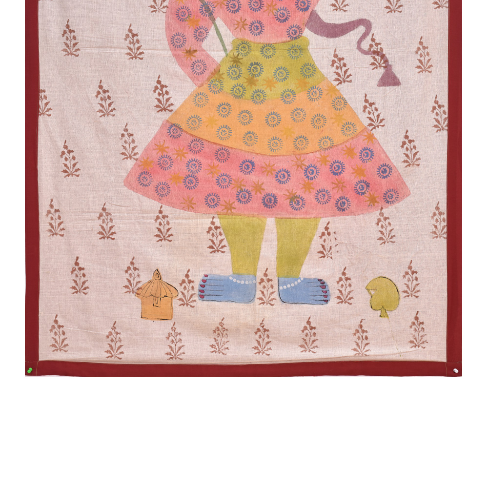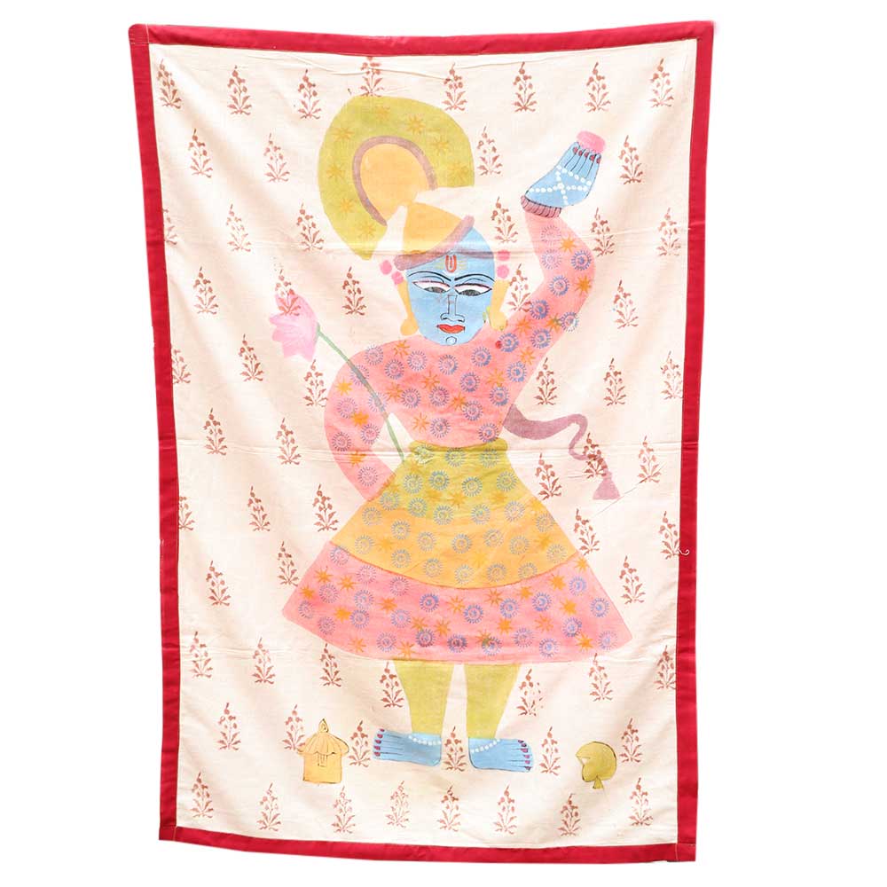 Folk Nathwara Pichwai Painting of Lord Krishna with Leaf Motifs. This is an old and traditional folk art form where each painting is made by hand on a cloth using natural colors. Hotel reception, lobby, conference hall, restaurant ,resorts, malls and temple decoration.