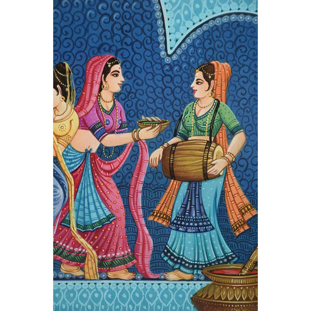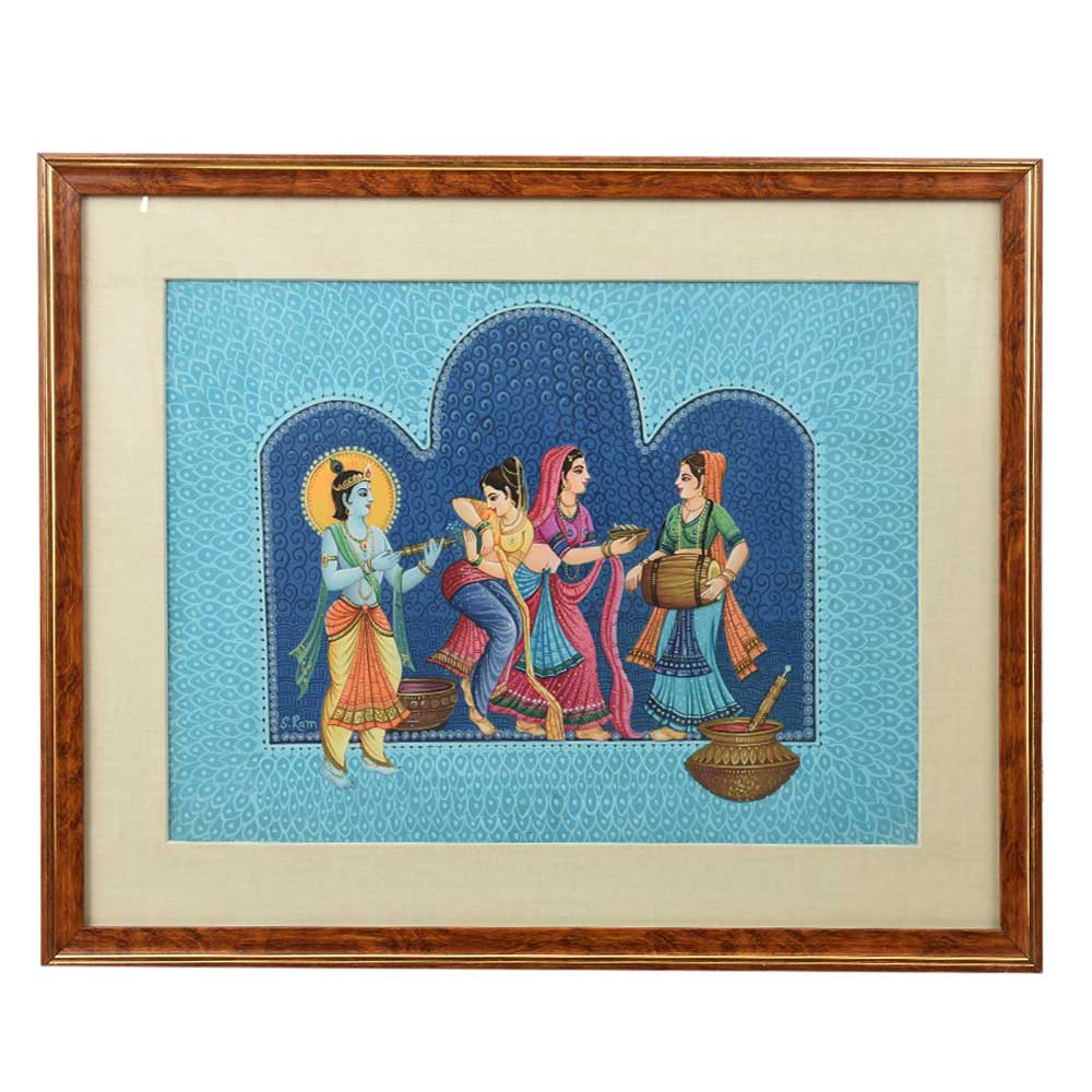 An impeccable Calendar Art Painting of the Divine Lord Krishna enjoying Holi with his gopis while they are playing the drums, dancing protecting themselves from  Lord Krishna who is splashing water at them.