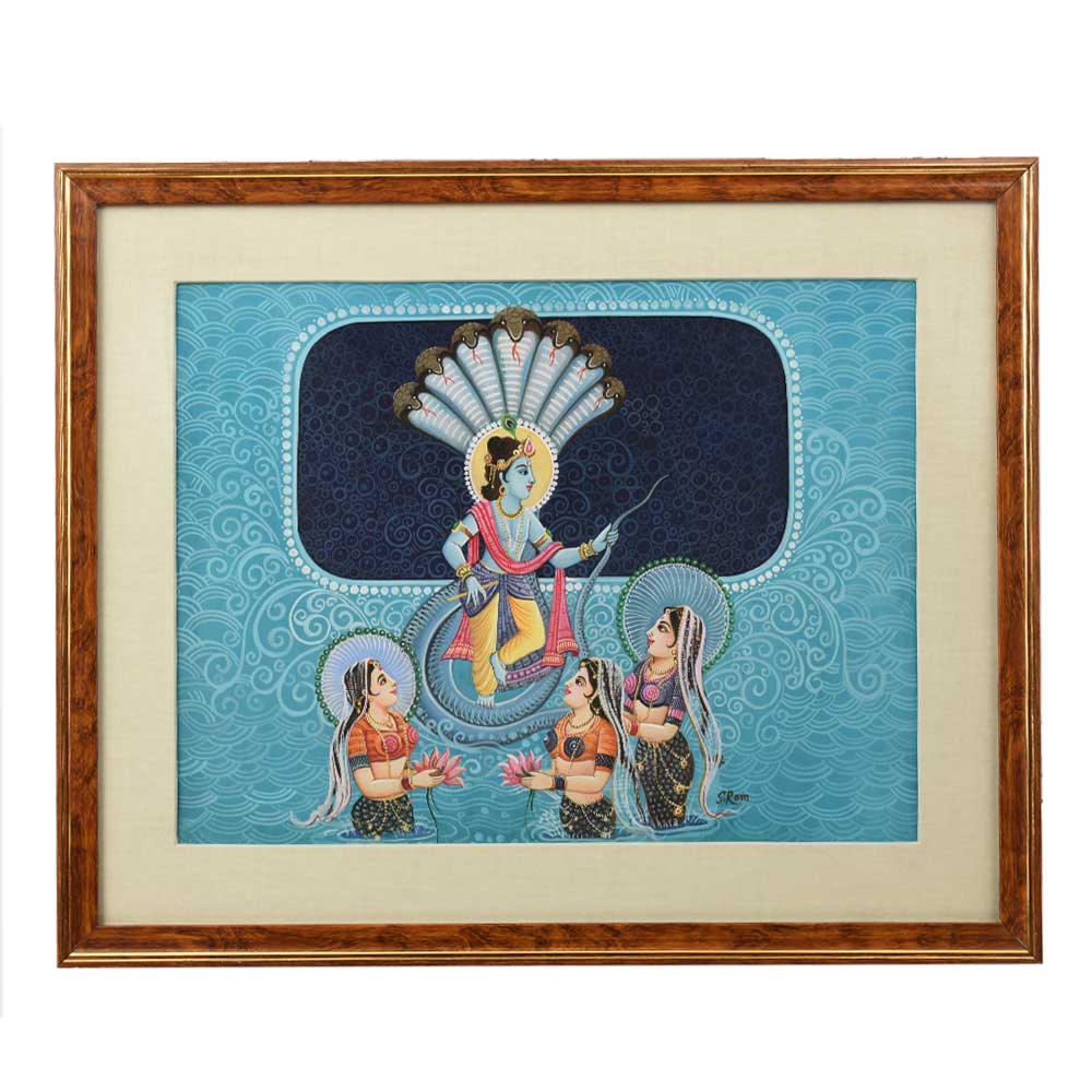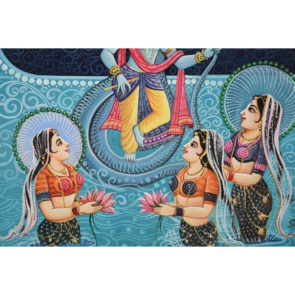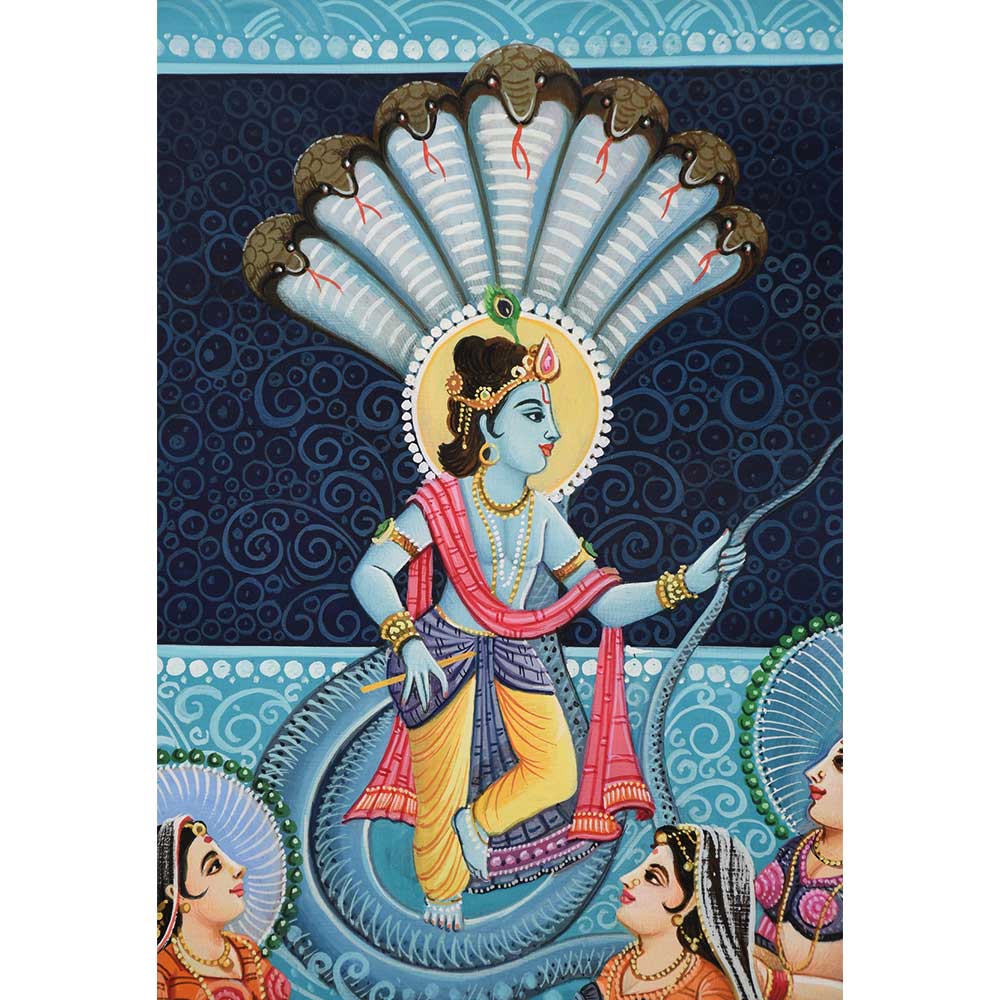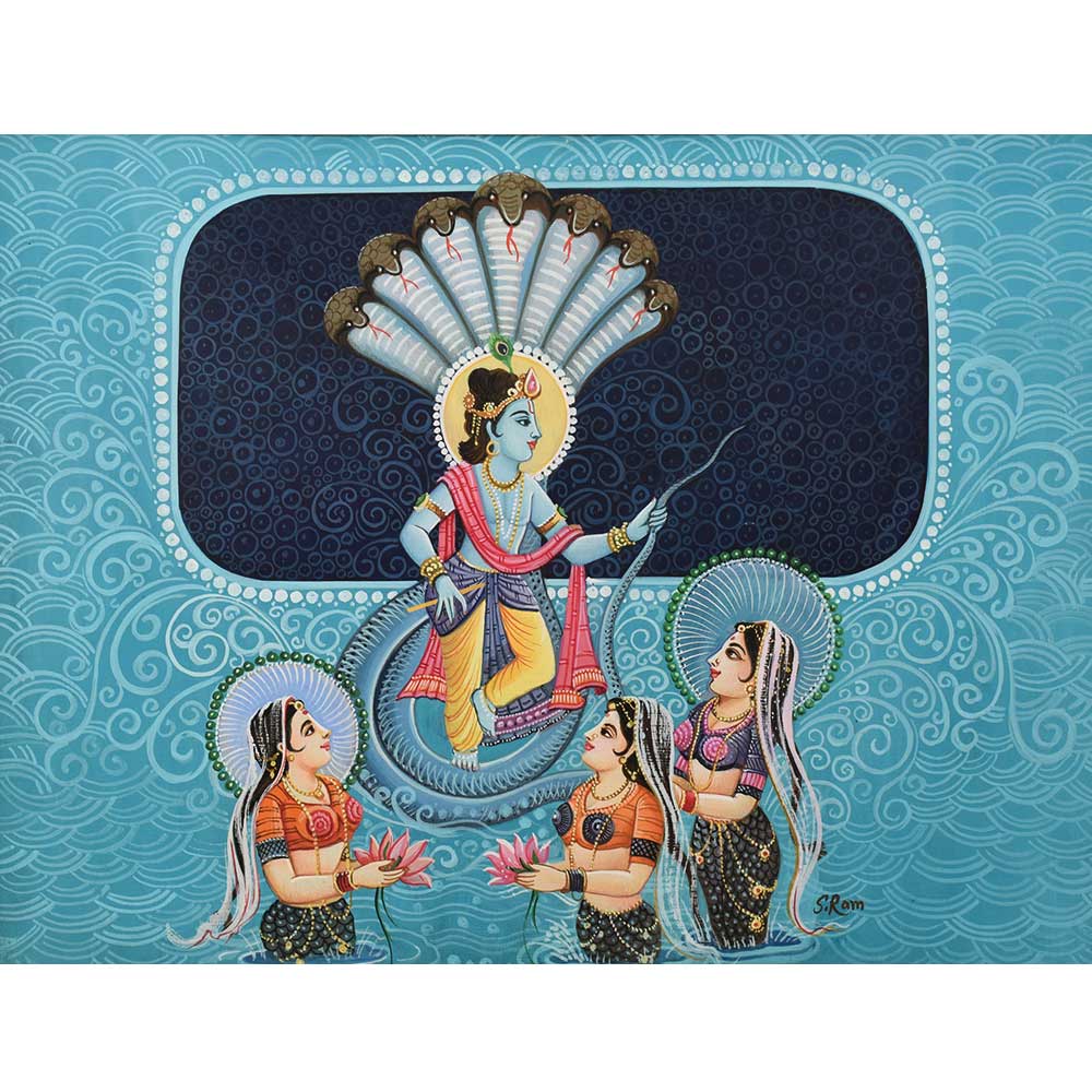An exquisite Krishna Raas Leela Calendar Art Painting illustrating Lord Krishna with Sheshnaag raising his hood above him engaged in Raas Leela with his Gopis.