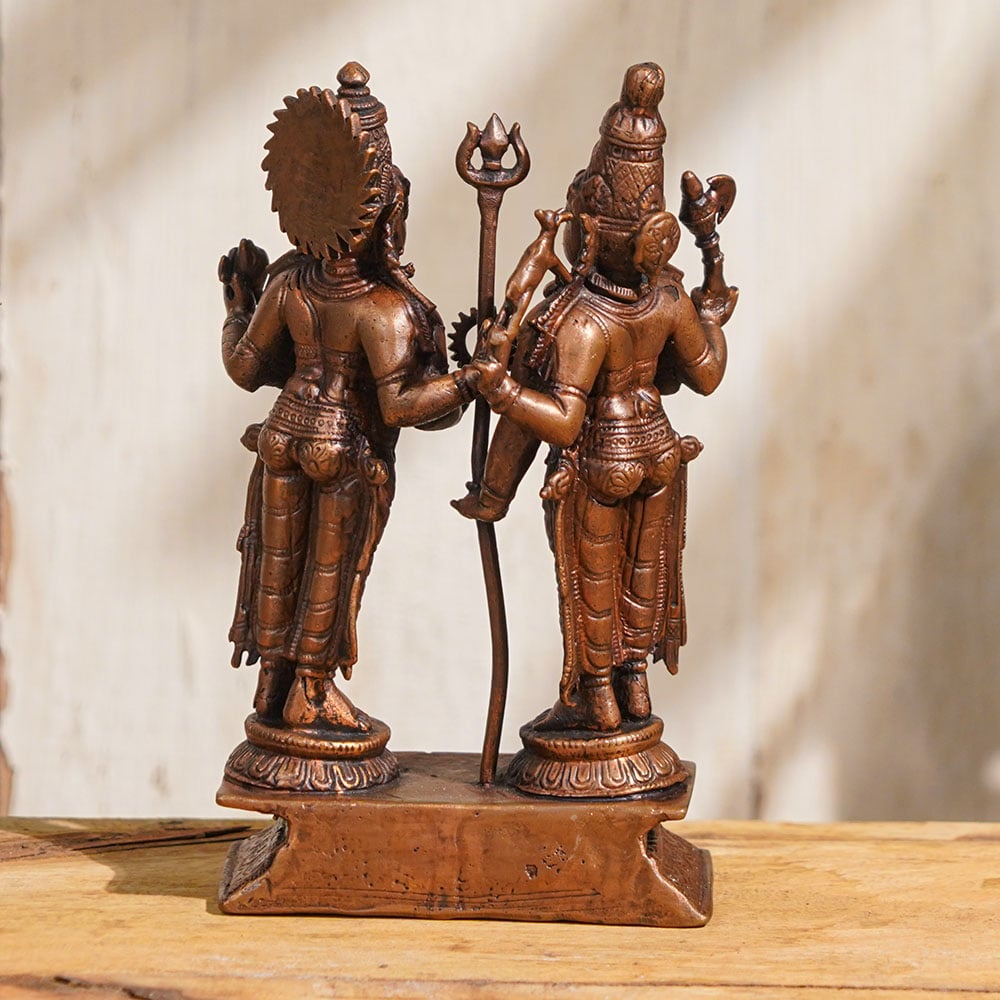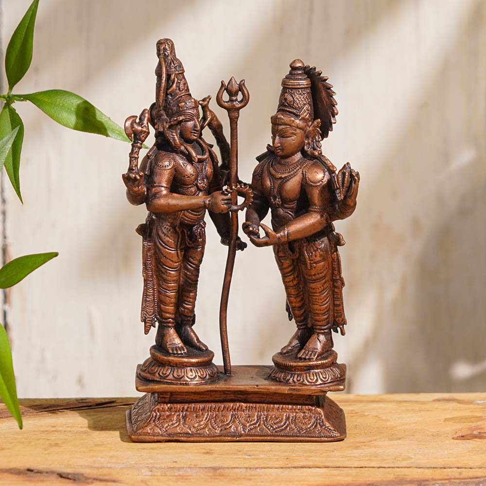 Embrace the divine union of Lord Shiva with his consort, Goddess Parvati, with this exquisite copper statue handcrafted by highly skilled Indian artisans. Lord Shiva, the powerful and benevolent deity, is depicted in a majestic standing posture, adorned with intricate details that capture the essence of his divine form. Beside him stands the graceful and serene Goddess Parvati, his divine counterpart and the epitome of feminine strength and beauty. This Lord Shiva with Goddess Parvati copper statue is a masterpiece of artistry, showcasing the craftsmanship and devotion of Indian artisans. It is perfect for worshipping in your home temple, inviting the blessings of Lord Shiva and Goddess Parvati for strength, prosperity, and happiness in your life. Its intricate details and exquisite design make it a timeless addition to your home decor, elevating the spiritual ambiance and creating a divine aura. Buy Lord Shiva Murti online and bring the divine presence of Lord Shiva and Goddess Parvati into your home, enhancing your spiritual practice and adding a touch of elegance to your abode. It also makes an incredible gift for special or auspicious occasions, conveying your reverence and good wishes to your loved ones.