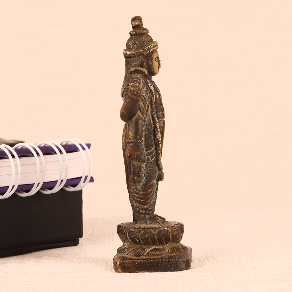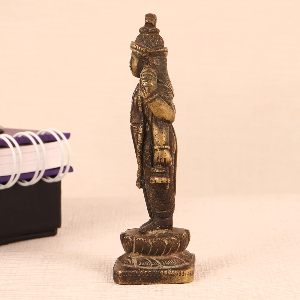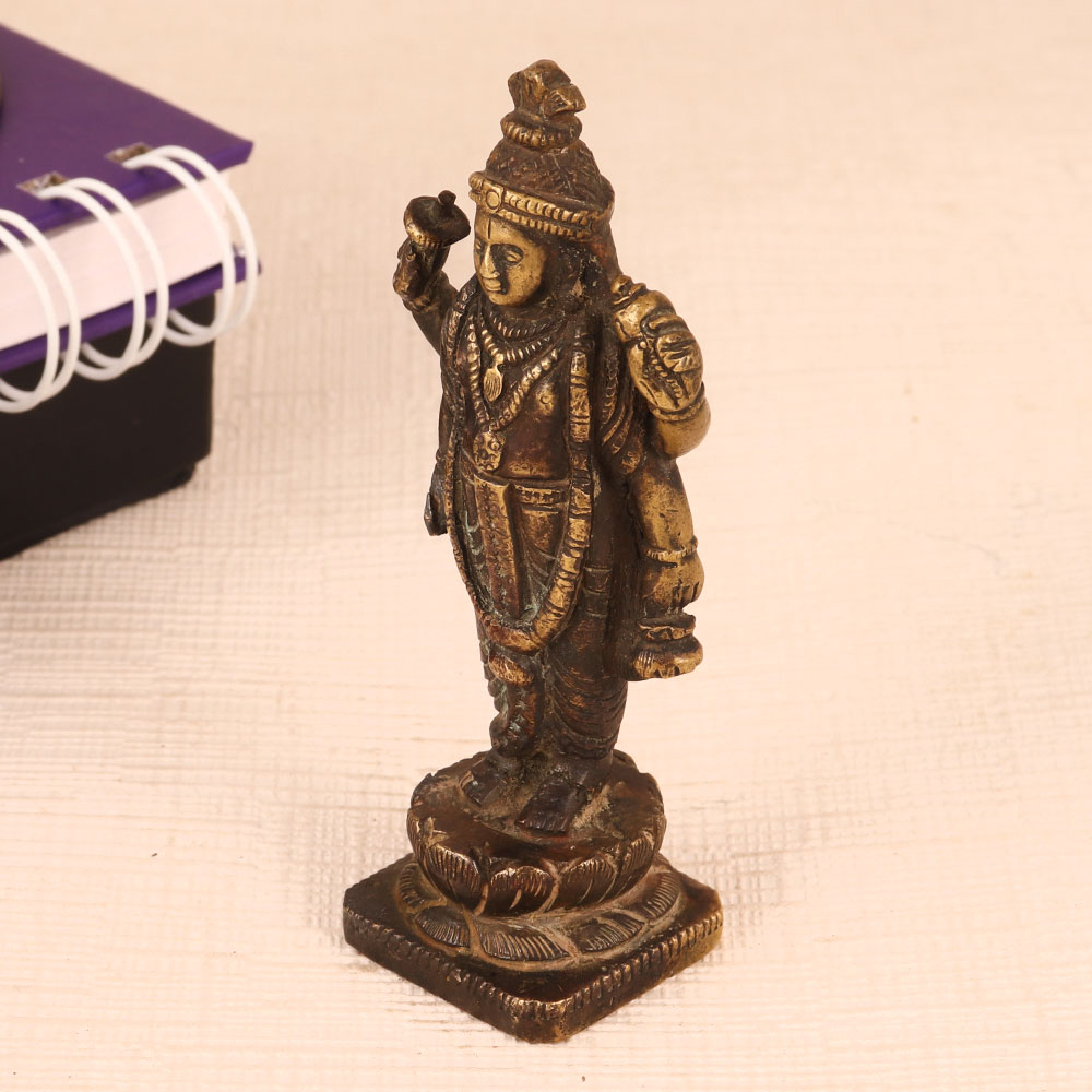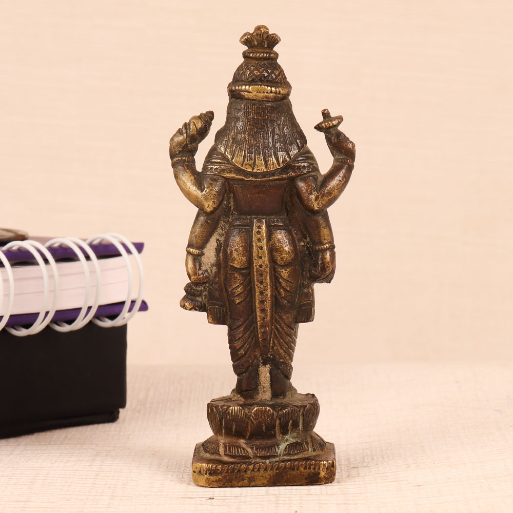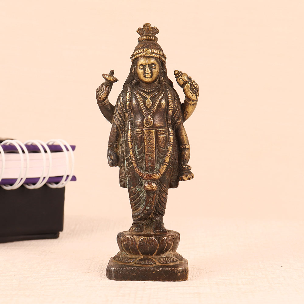 Buy a brass statue of Lord Vishnu online and get a hassle free delivery to your doorstep. Crafted by highly skilled Indian artisans with a profound reverence for tradition, this remarkable piece stands as a testament to the rich cultural heritage of India. Standing atop a meticulously detailed platform, the statue is finished in an antique brown hue adding a sense of antiquity and authenticity to its design. Lord Vishnu, one of the principal deities in Hinduism, is depicted in all His divine glory, exuding a sense of serenity and power. This splendid creation is not just an art piece but a spiritual symbol that can be cherished in various settings. Place it in your home, office, restaurant, hotel, cafe, or shop prayer room to infuse the surroundings with an aura of spiritual significance and aesthetic beauty. It also makes for an ideal addition to any vintage collection, appealing to collectors with an appreciation for artistry and culture. Furthermore, this statue serves as a thoughtful and meaningful gift for your loved ones on special, festive, or auspicious occasions, conveying your best wishes and blessings through a symbol of divine presence.