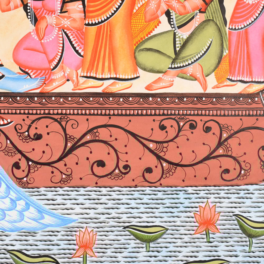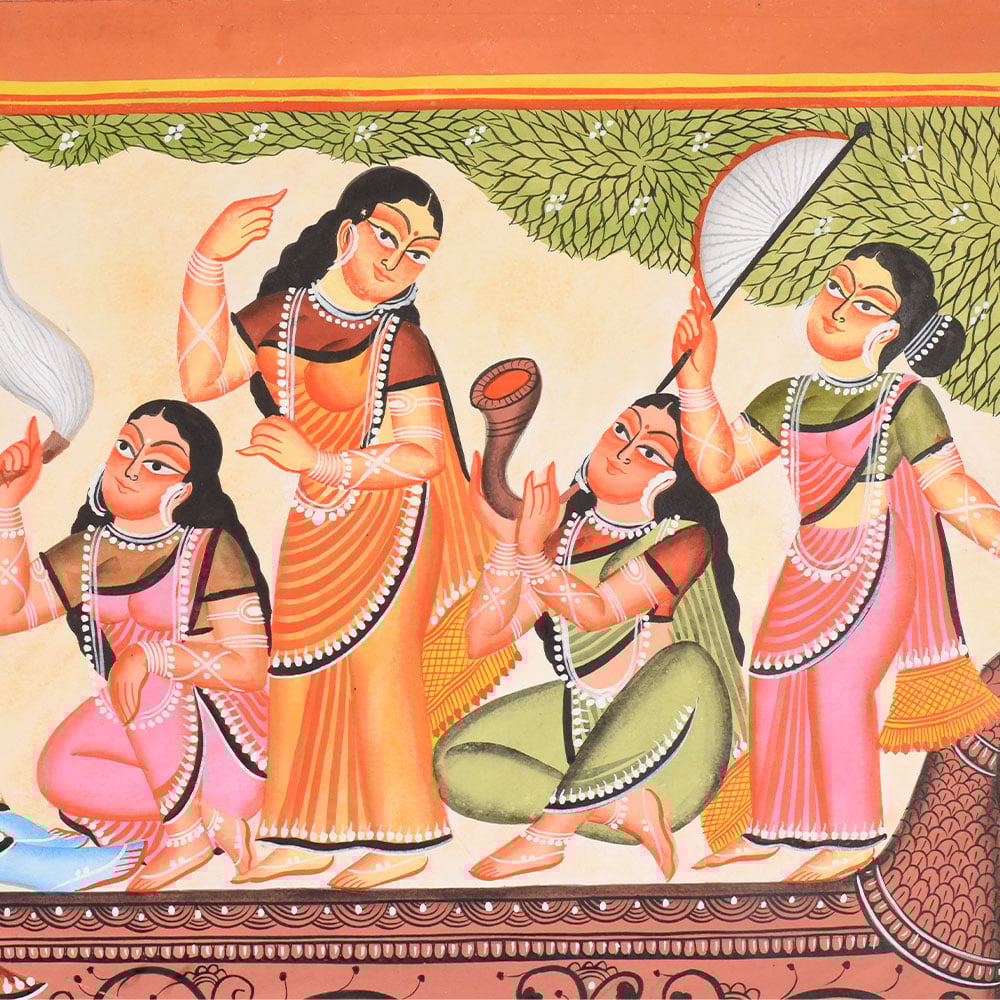 This Kalighat painting on cloth and paper portrays a lively mythological river journey, blending divine presence with festive courtly life in the distinctive Kalighat folk style. At the center of the composition is Lord Vishnu, identified by his blue complexion and serene expression, reclining gracefully inside an ornate makara-shaped boat. The boat, richly decorated with scrolling floral motifs and a sculpted bird-like prow, glides across stylized waters filled with lotus flowers and floating leaves, creating a rhythmic visual flow. Surrounding Vishnu are elegantly dressed female attendants, shown mid-gesture with flywhisks, fans, and musical instruments. Their animated poses, tilted heads, and expressive almond-shaped eyes convey movement, devotion, and celebration, as if accompanying the deity in a royal procession. Vishnus relaxed posture contrasts beautifully with the lively attendants, reinforcing his divine calm amid worldly motion. The makaras large wing and curved neck dominate the left side, adding both symbolic protection and visual drama to the scene. The river is depicted through repeated horizontal lines, a classic Kalighat technique that maintains flatness while suggesting motion. Lotus buds and leaves punctuate the water surface, while dense green foliage arches across the top of the painting, framing the narrative like a natural canopy. The palette is warm and harmoniousreds, oranges, greens, and bluesoutlined with confident black lines. A bold decorative border encloses the scene, enhancing its iconic, shrine-like quality. Executed on cloth and paper, this painting reflects the Kalighat artists skill in transforming mythological themes into accessible, story-rich imagery that feels both devotional and theatrical, capturing a moment of divine leisure and celebration.