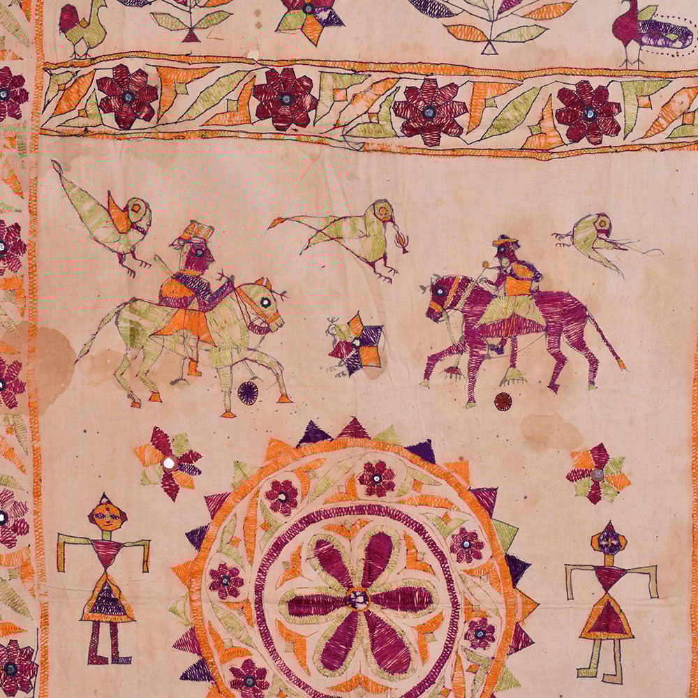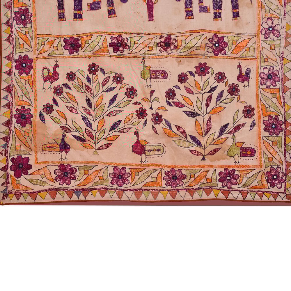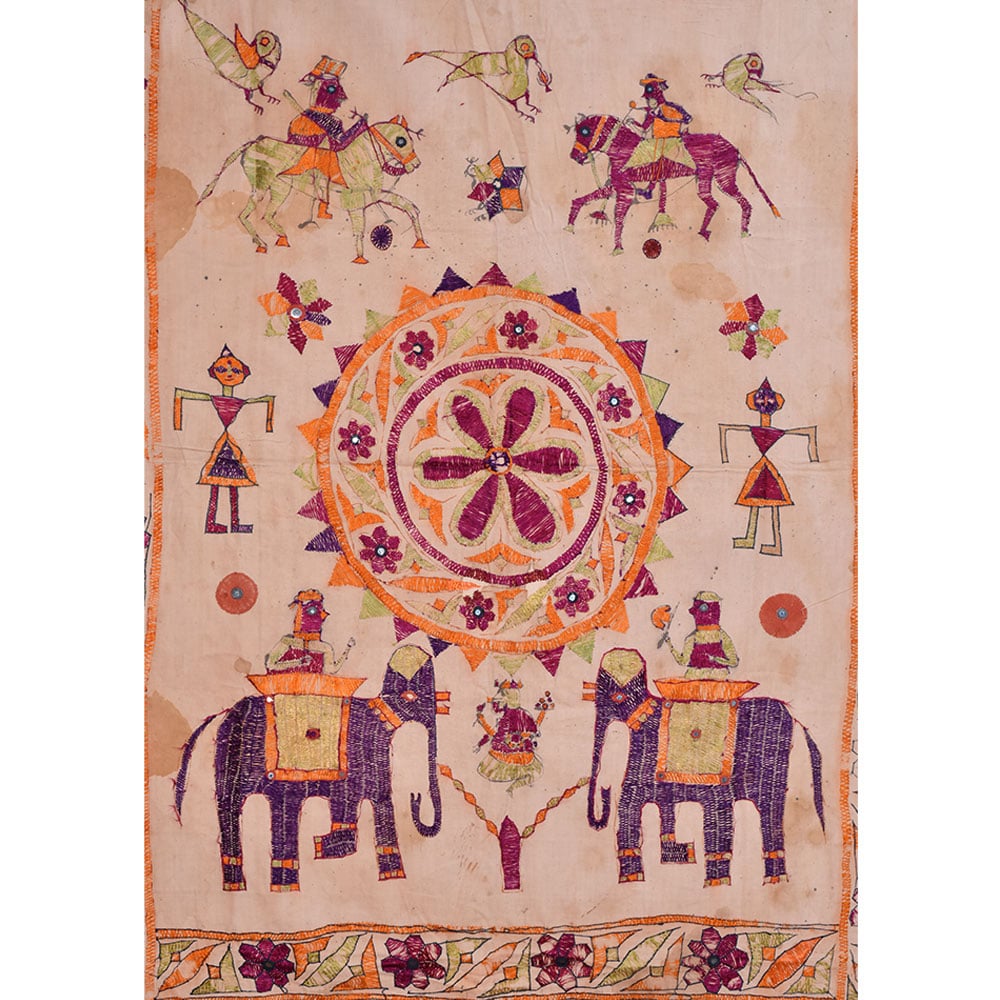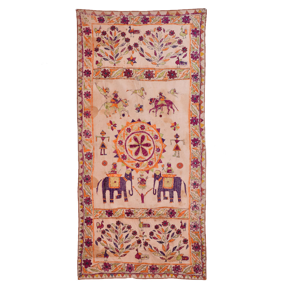 A Pichwai painting on fabric cloth is a beautiful work of art that depicts stunning art designs and floral patterns. This particular painting features two majestic elephants with riders and two horses with riders, all adorned in traditional Indian attire. The background is a breath-taking display of intricate floral patterns and foliage, accented with peacocks and other birds. The painting has been meticulously painted by professional Indian artists using a multi-colour palette, resulting in a vibrant and eye-catching piece of art. Its intricate detailing and rich colours make it a perfect addition to your prayer room or temple, as it exudes a sense of peace, tranquillity, and spirituality. This Pichwai painting on fabric cloth also makes an auspicious gift for your loved ones on special occasions such as weddings, festivals, or any other joyous celebrations. It is a thoughtful and meaningful gift that will be cherished for years to come, reminding them of the beauty and richness of Indian art and culture.