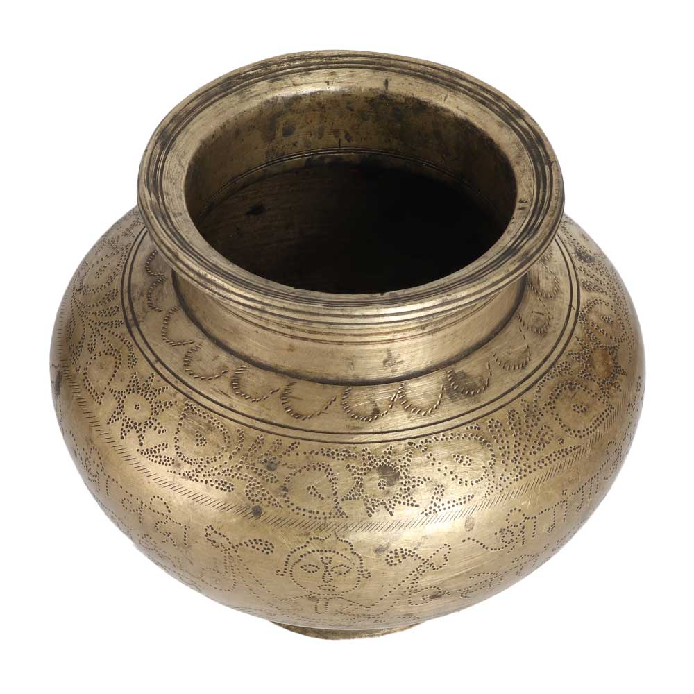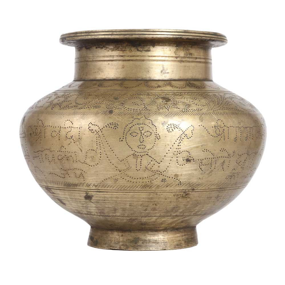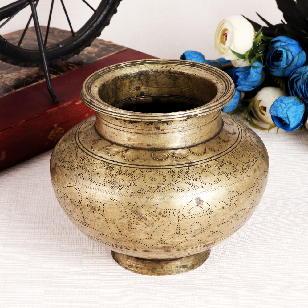 A beautiful brass lota carved with figures and texts in Hindi language with needle. This water pot is handmade by local artisans from India, making it an exceptional piece for decoration and vintage collection. Buy this handmade lota, which is made of high quality brass and gives a remarkable impression in decoration. Place this lota as a planter for your living room, hallway or entryway and it will enhance the interior design. Its beautiful design makes it stand out from other pots and it is often used for stage, wedding and birthday decorations. A tempting gift for your family, friends or relatives on special and festive occasions.