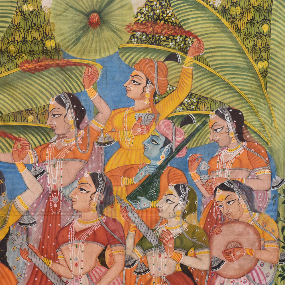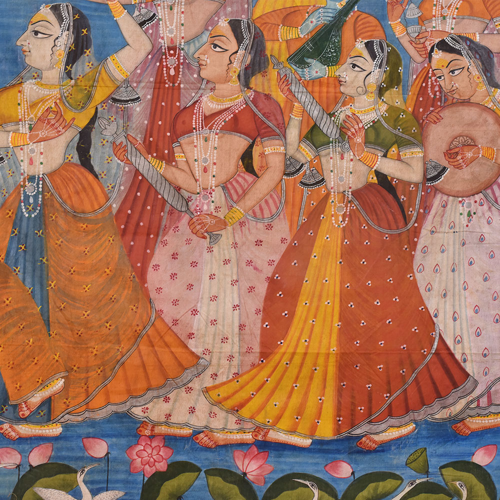 This beautiful Pichwai painting on fabric cloth depicts a group of women dancing and playing musical instruments, surrounded by lush trees in the background. At the bottom of the painting, a graceful swan and a lotus flower can be seen. The floral border design adds to the overall beauty and intricacy of the painting, which has been painted by professional Indian artists in multi-colour. This Pichwai painting is a perfect addition to any prayer room, as it depicts a scene of joy and celebration. The women in the painting are dressed in vibrant traditional clothing and their movements convey a sense of energy and happiness. The swan and lotus symbolize purity and grace, adding a deeper meaning to the painting. As a gift, this Pichwai painting is a wonderful choice for any special or festive occasion. Its intricate details and beautiful colours make it a unique and memorable present for family, friends, or relatives. The painting's cultural significance and stunning beauty are sure to be appreciated and cherished for years to come.