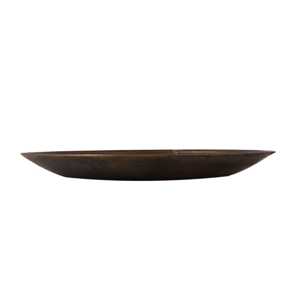 This brass trinket bowl is the ideal way to keep your valuable trinkets secure while also maintaining the aesthetic appeal of your dresser or bedside table. This tray is a classic piece that works equally well in a bohemian bedroom as it does in a minimalist setting. The dish has a wide bowl and shallow sides and is made entirely of brass. Due to its slightly rounded shape, this item works best as a trinket bowl for holding loose change, rings, and earrings. It could also serve as a holder for a tiny candle. Use it for gifting or personnel use. It comes in a dark patina finish.