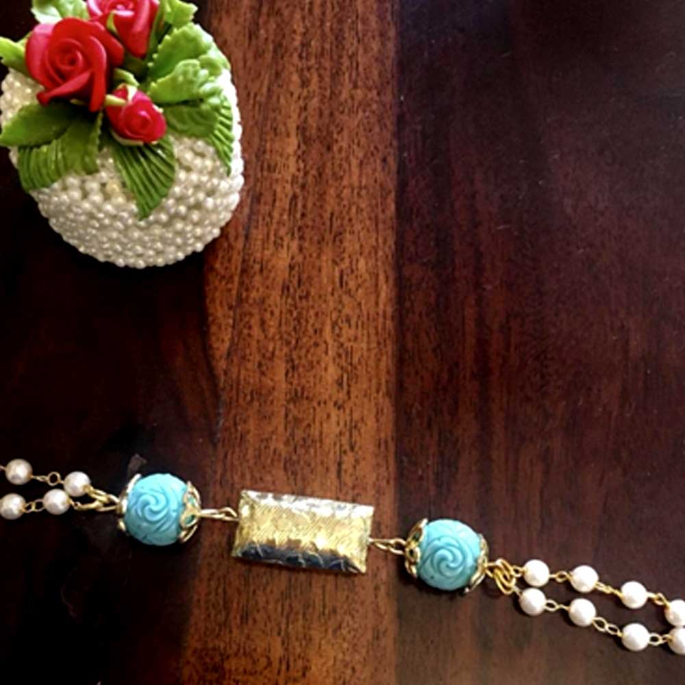 Selfdesign gold polish center with emgraved blue beads with pearl ghanthan.