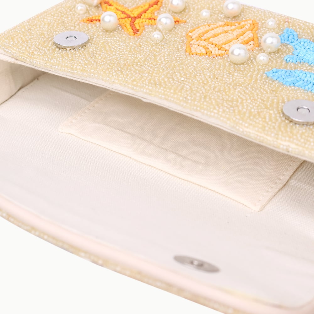 - Pattern: Hand-beaded design with ocean-inspired motifs including seashells, starfish, and fish.