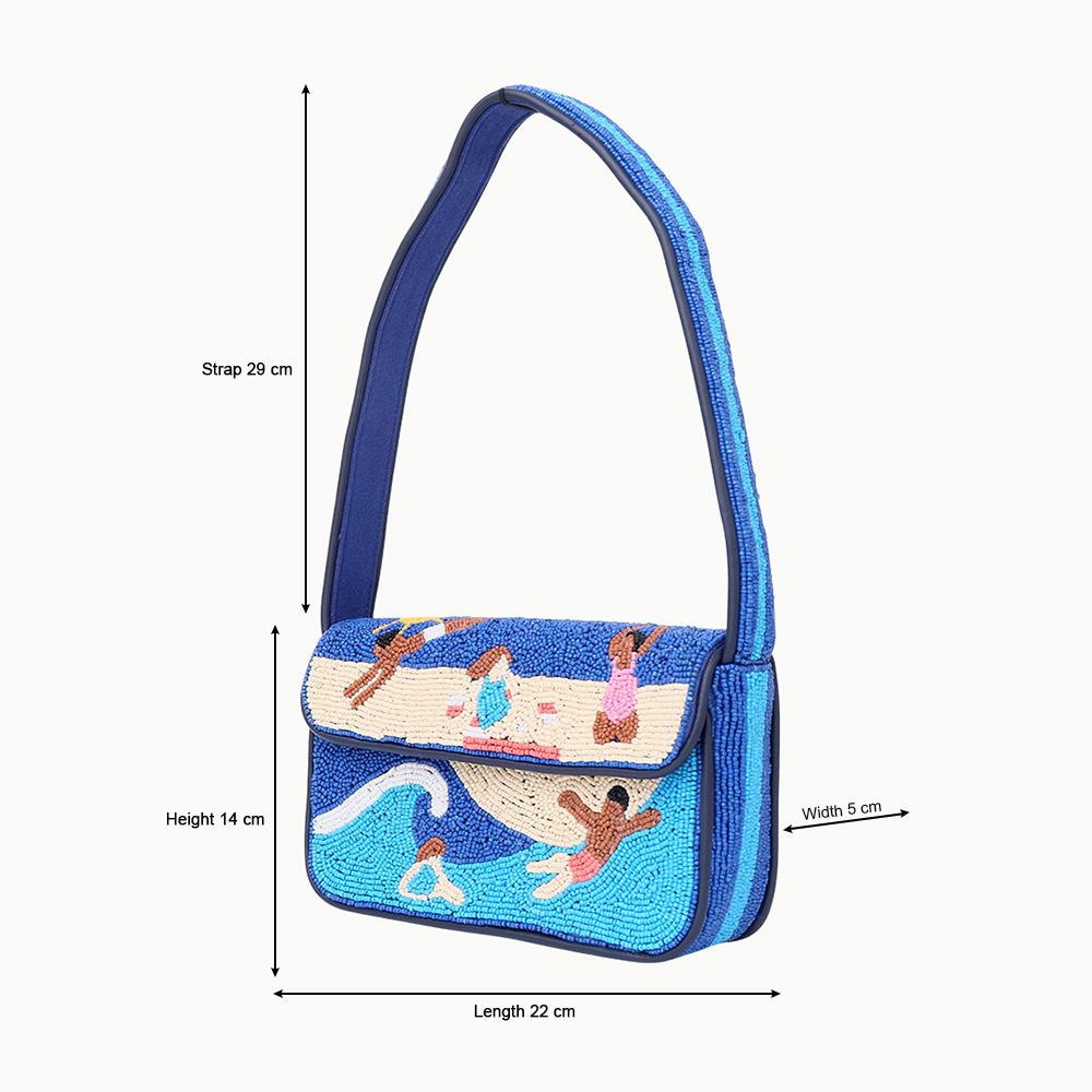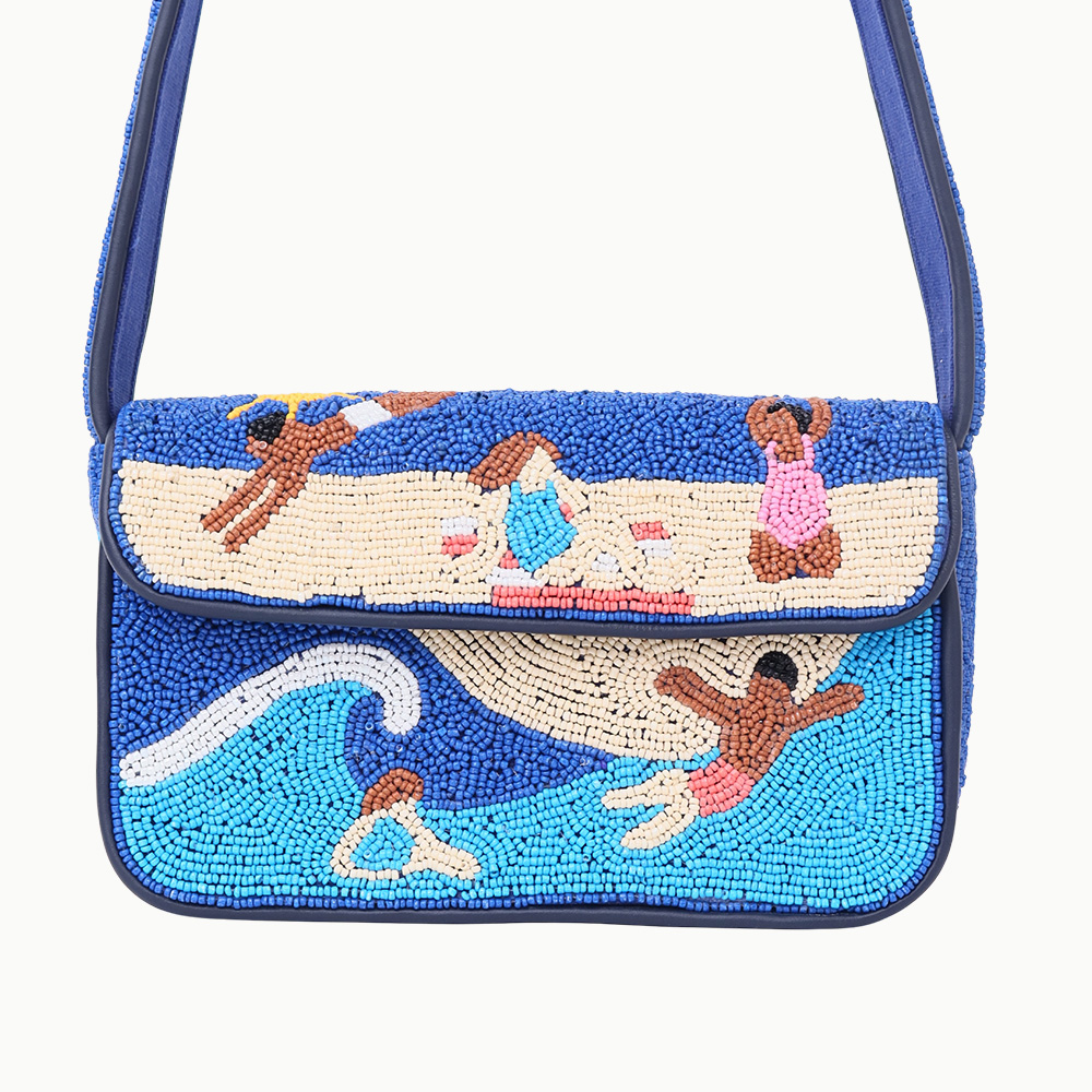 Bring summer vibes everywhere you go with this luxury handmade beaded shoulder bag, designed with a playful beach scene pattern. Crafted with premium glass seed beads, this artistic bag showcases figures relaxing on sandy shores with waves, palm trees, and sunshine. Its vibrant blue tones and intricate detailing make it a unique statement piece for holidays, parties, or casual chic looks. With a fully beaded strap and secure flap closure, it’s the perfect blend of luxury craftsmanship and creative fashion.