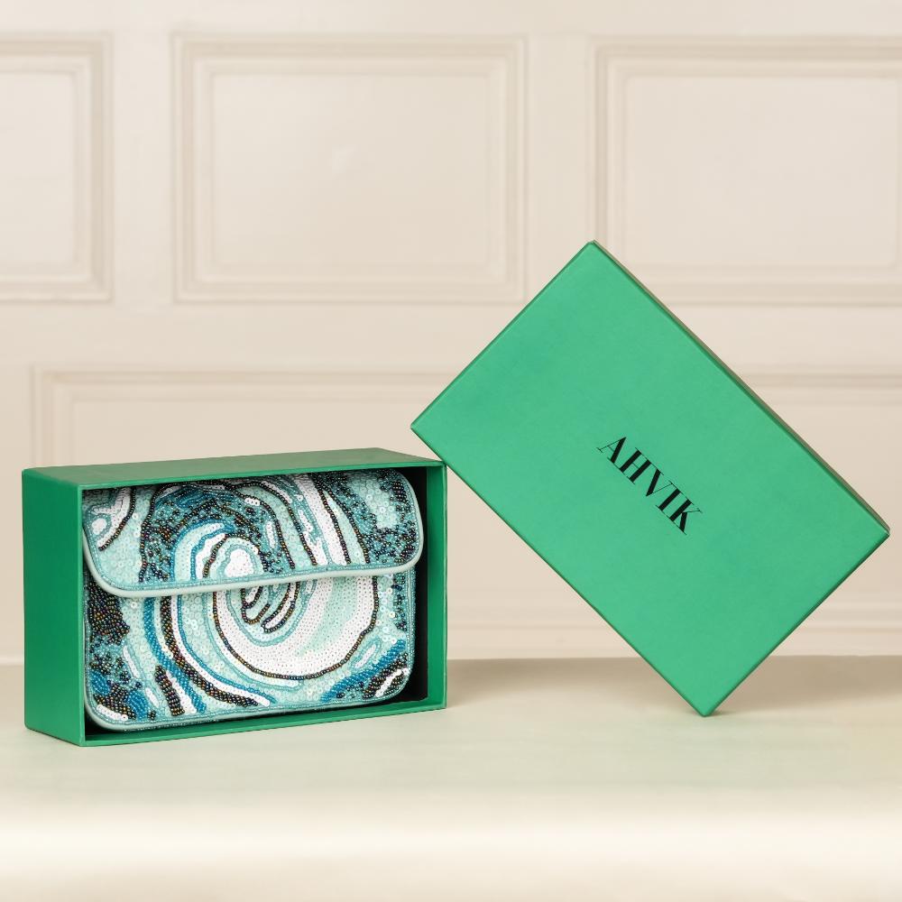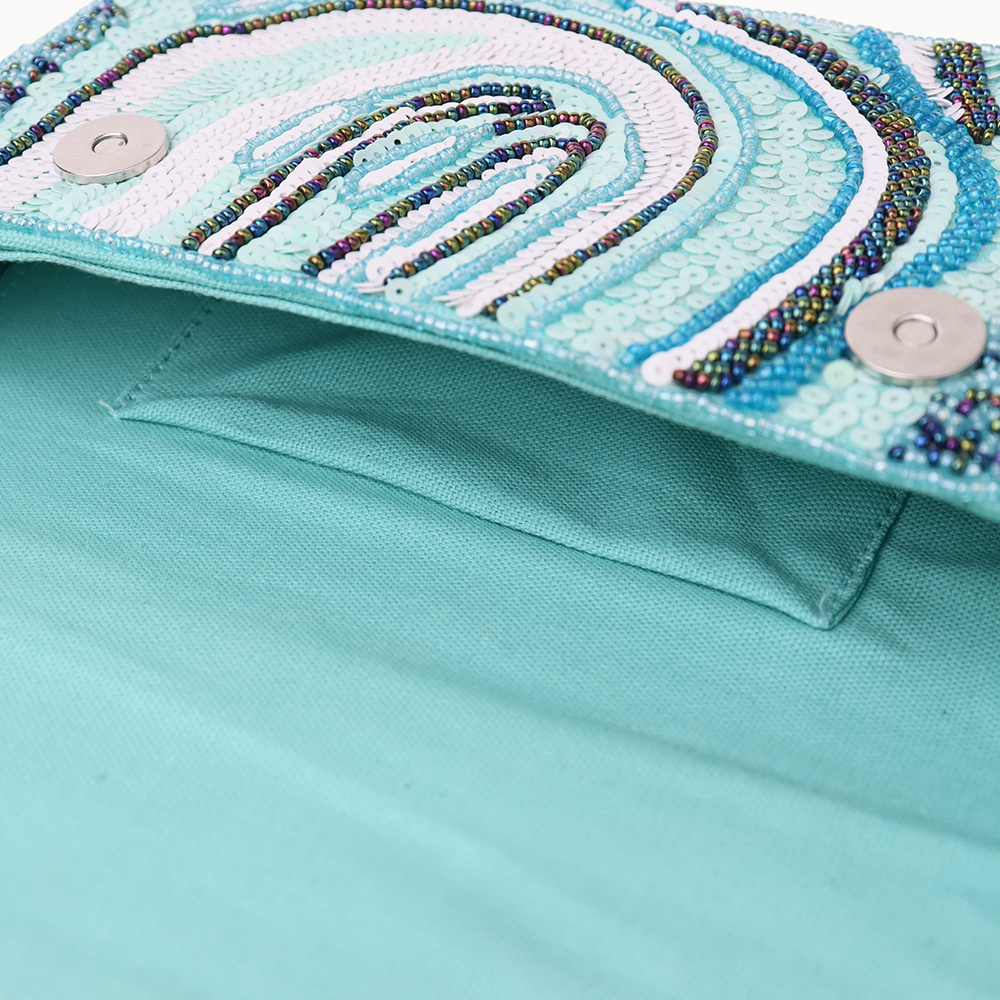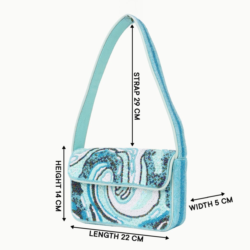 Turn heads with this luxury handmade beaded shoulder bag, designed in a stunning blue abstract swirl pattern with sequins. Crafted with premium glass beads and shimmering sequins, this statement bag captures the beauty of flowing water and artistic textures. Its unique abstract design in shades of aqua, turquoise, white, and metallic accents makes it a bold fashion choice for both day and evening occasions. With its durable construction and elegant detailing, it is the perfect luxury accessory for modern, artistic styling.