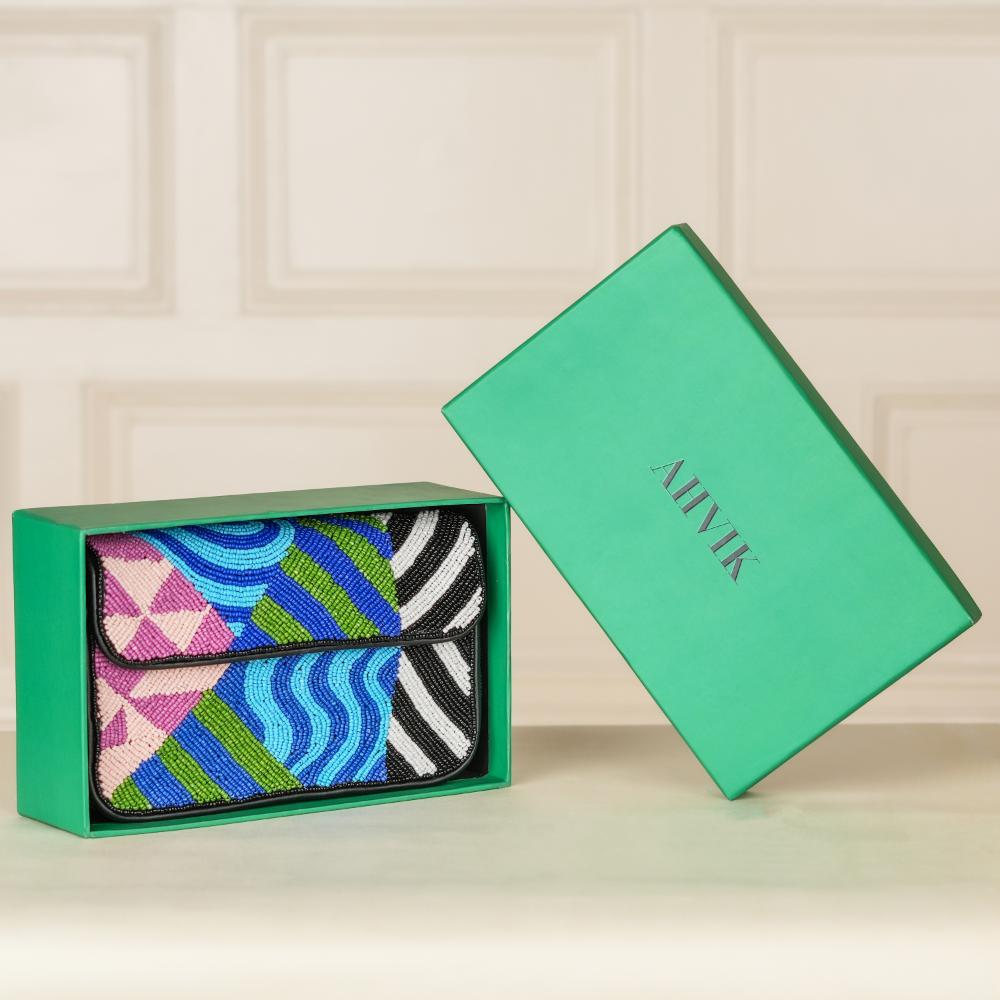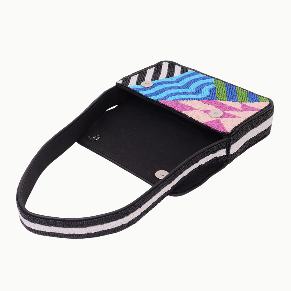 Step into style with this luxury handmade beaded shoulder bag, beautifully designed in a bold geometric abstract pattern. Crafted with high-quality glass seed beads, the bag features vibrant shades of blue, green, pink, and black arranged in modern stripes, waves, and triangles. With its artistic design, fully beaded strap, and secure flap closure, this bag is a perfect statement accessory for parties, weddings, festive events, and chic everyday looks.