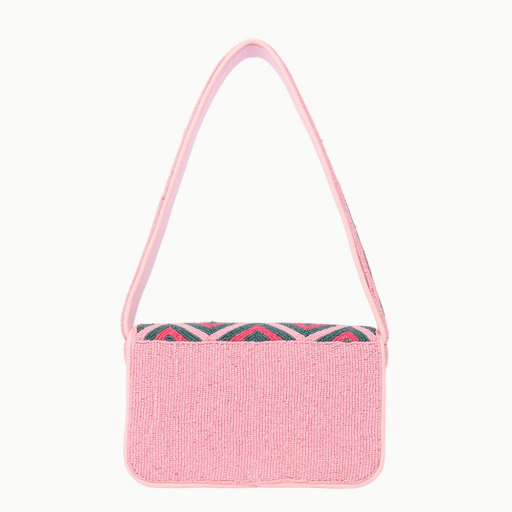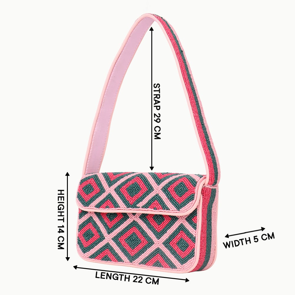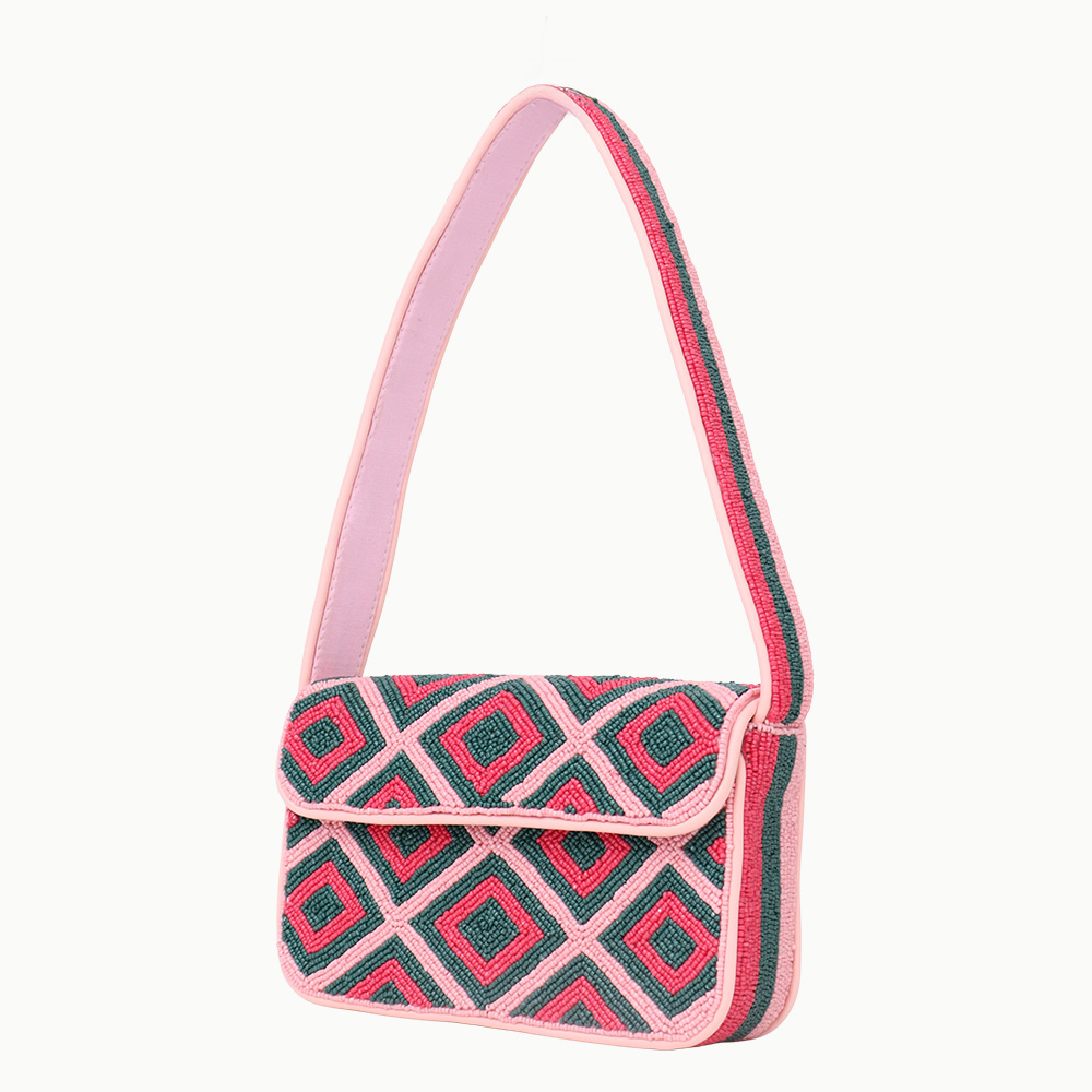 Elevate your style with this Luxury Handmade Beaded Shoulder Bag, showcasing a striking diamond geometric pattern in pink and green hues. Crafted with fine seed beads and artisan precision, this bag exudes sophistication and vibrance. Its structured silhouette and comfortable strap make it perfect for both everyday outings and special occasions, adding a bold and artistic statement to your wardrobe.