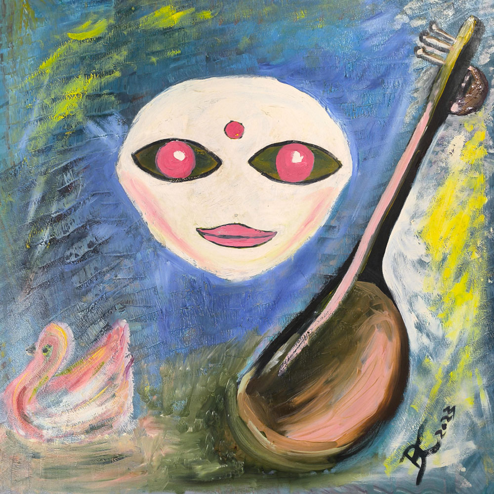 This striking oil painting on stretched canvas presents an abstract and deeply symbolic portrayal of Maa Saraswati, the revered Hindu goddess of knowledge, music, arts, and wisdom. Central to the composition is the serene, expressive face of Saraswati, depicted with gentle eyes that radiate wisdom and compassion. Her divine presence is accentuated by the presence of a gracefully depicted veena, her sacred instrument, symbolizing harmony, creativity, and spiritual insight. Accompanied by a graceful swan, representing purity and enlightenment, the artwork is rendered in rich blues, soft pinks, and luminous whites, creating a harmonious aura of tranquility and divine inspiration. Perfect for inviting wisdom, artistic inspiration, and spiritual serenity into your home or sacred space.