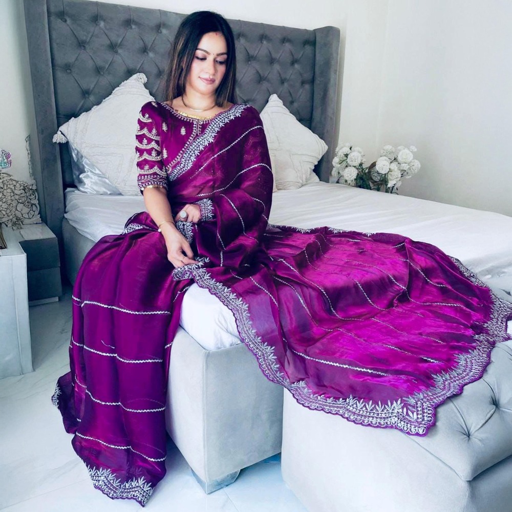 Drape yourself in rich bridal elegance with this Bollywood-style magenta organza silk saree, a showstopper crafted for the modern woman who cherishes traditional beauty. The vibrant magenta hue radiates festivity and grace, enhanced with shimmering silver thread lines that diagonally flow across the body. A finely embroidered scalloped silver zari border frames the saree beautifully, adding a regal touch to its airy, translucent texture. Crafted from premium pure organza silk, the saree is lightweight yet rich in visual appeal, making it ideal for weddings, sangeet ceremonies, or bridal photoshoots. The luxurious fall, paired with the glimmer of zari embroidery, creates a graceful movement that elevates every step you take. Pair it with a matching embroidered blouse and silver or kundan jewelry for a complete bridal or festive look.