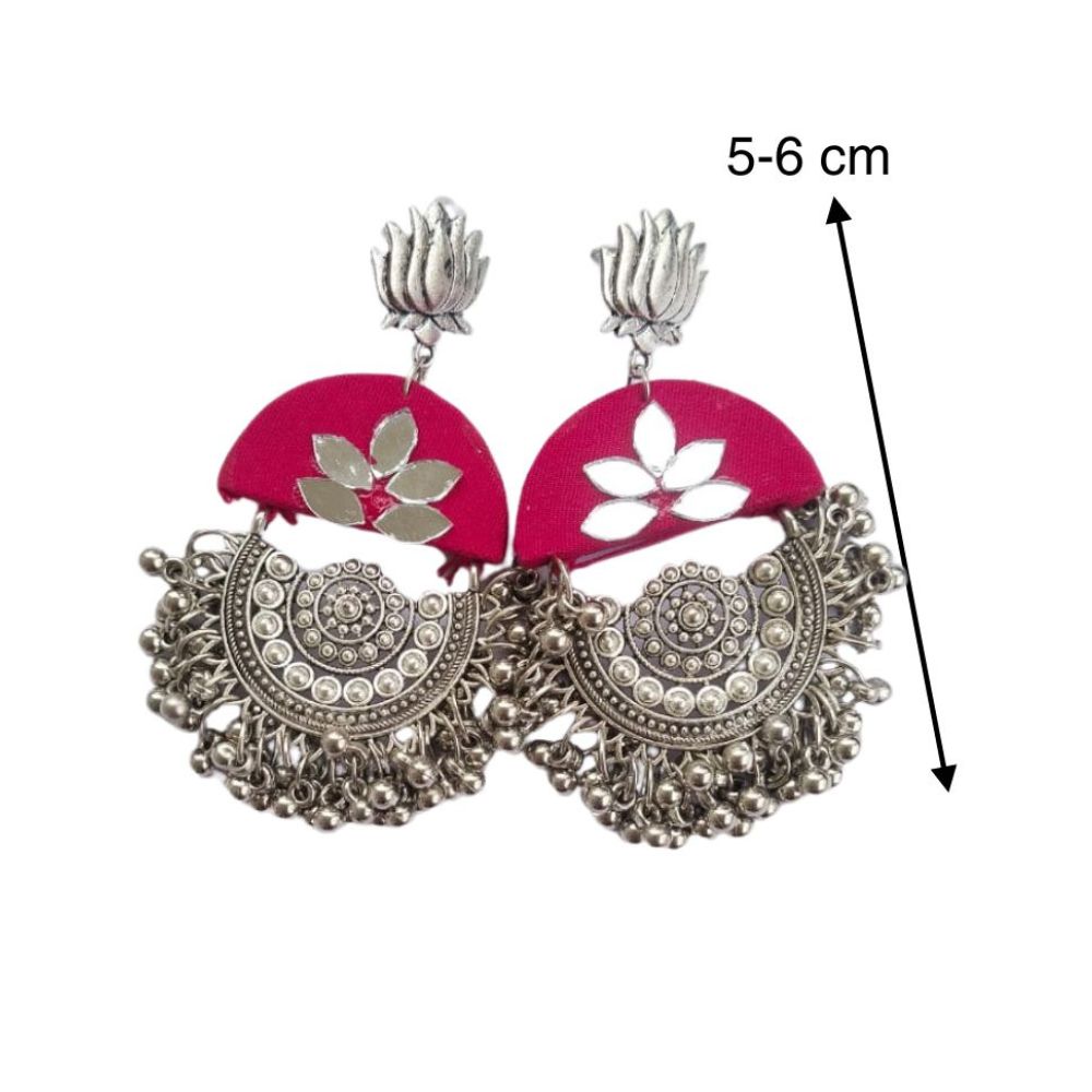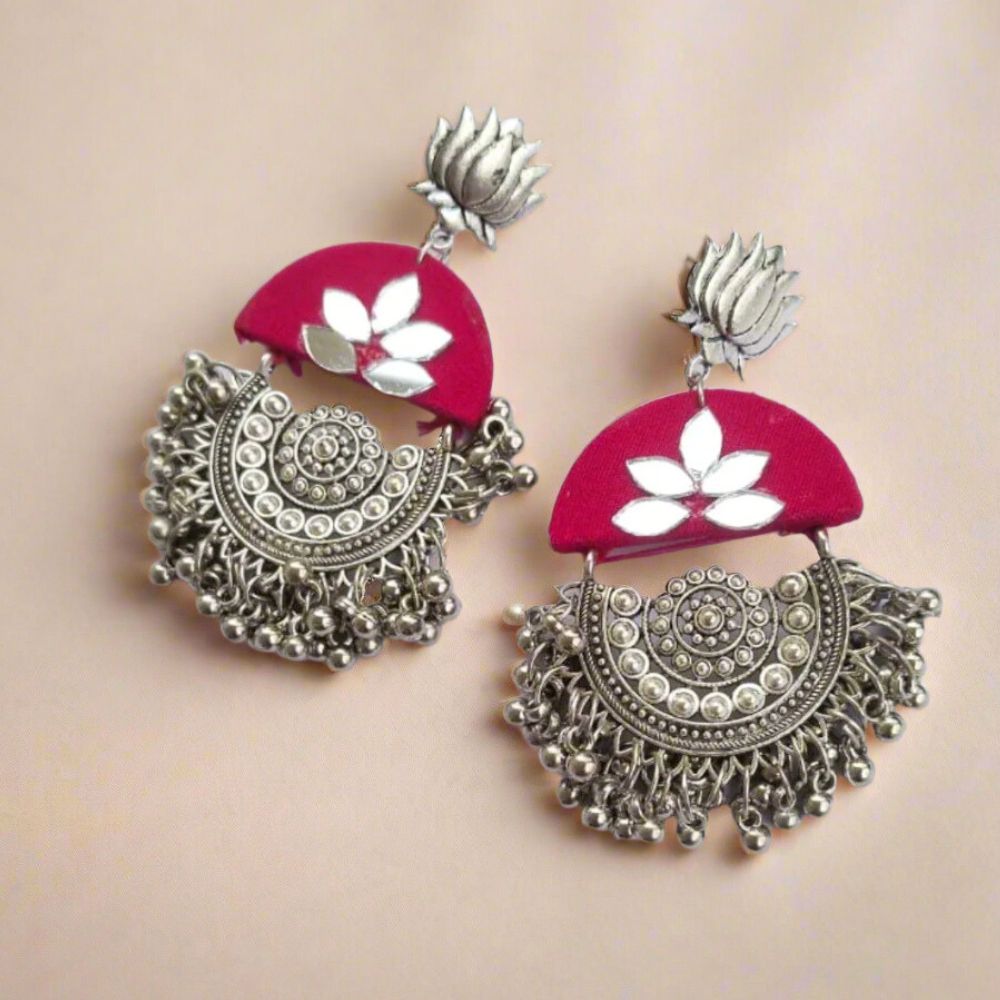These Magenta Rani Pink Heavy Oxidized Lotus Earrings bring together vibrant fabric colors and detailed oxidized metalwork in a striking, feminine design. Featuring bold magenta–rani pink fabric paired with a beautifully crafted lotus charm, the earrings offer a rich, cultural aesthetic. Lightweight yet statement-worthy, this handcrafted pair is ideal for women who love dramatic ethnic jewelry with symbolic meaning.