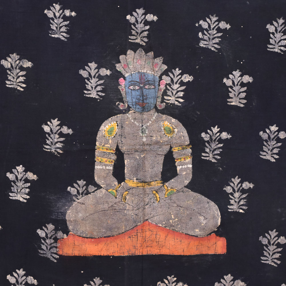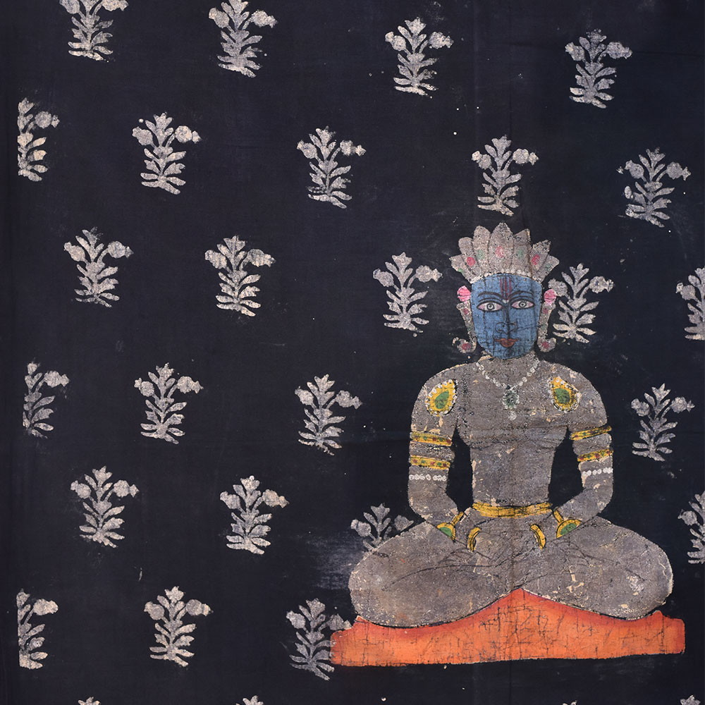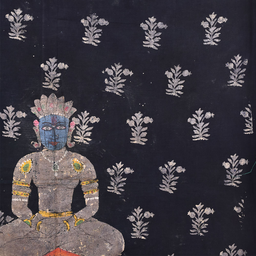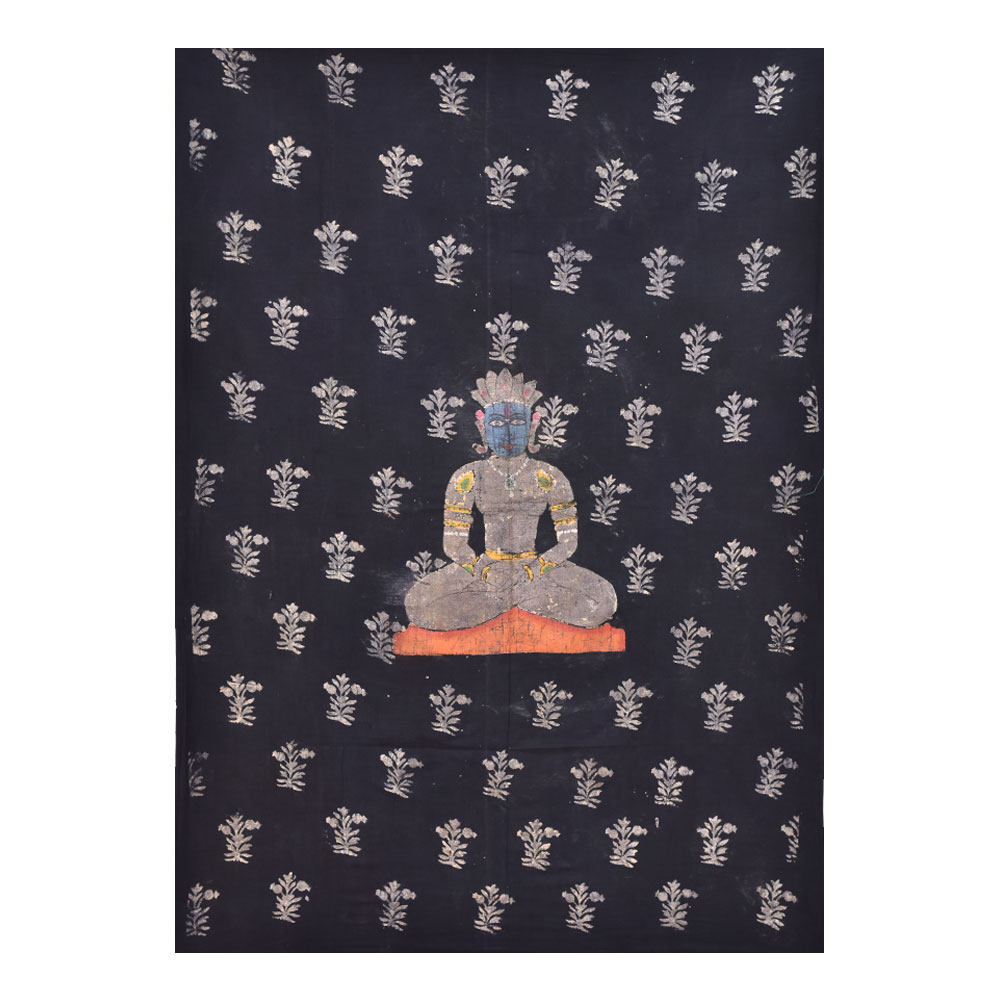 The Pichwai painting on fabric cloth depicting Mahavir Swami in meditation mudra is a true masterpiece of Indian art. Mahavir Swami, also known as Vardhaman, was the twenty-fourth and the last Tirthankara (teacher) of the Jain religion. This painting captures the essence of his peaceful nature and divine presence. The black background of the painting serves as a perfect backdrop for the intricate floral patterns that adorn the cloth. The multi-coloured painting is a testament to the artistic skill of the Indian painters who created it. This painting is a perfect addition to any prayer room, temple or living room. It brings an aura of serenity and tranquillity to the surroundings. It can also make an auspicious gift for family, friends or relatives on special or festive occasions. It is a unique way to celebrate the rich cultural heritage of India and to honour the teachings of Mahavir Swami. The Pichwai painting is a timeless piece of art that will inspire and uplift for generations to come.
