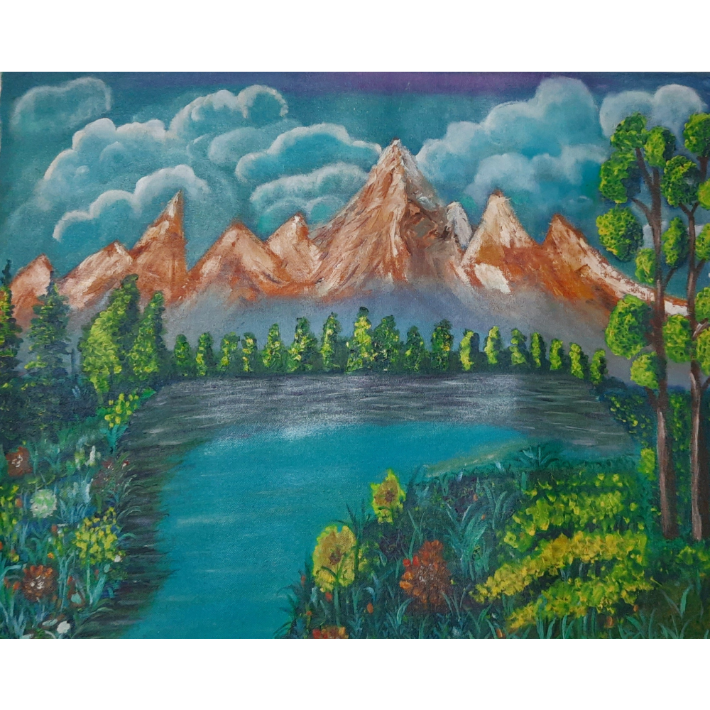Experience the tranquility of nature through this striking Acrylic on Canvas landscape painting by Artist Gayatri Sharma, titled Majestic Mountain Landscape. Measuring 27 x 21 inches, this hand-painted artwork captures the awe-inspiring beauty of snow-kissed mountain peaks reflected in a serene turquoise lake, surrounded by lush greenery and blooming flora.The composition draws the viewer’s eye from the vibrant forest foreground to the towering cliffs and dramatic skies, evoking a sense of peace and grandeur. The use of bold brushstrokes and rich textures brings each natural element to life—from the rippling water to the towering peaks and swirling clouds.Perfect for nature lovers and art collectors, this painting adds a refreshing, earthy energy to living rooms, offices, or gallery walls.
