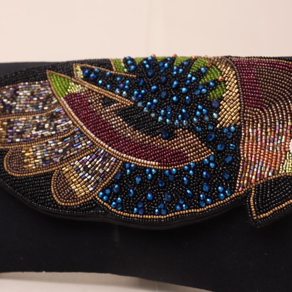 Let your accessories take flight with this handcrafted clutch featuring an exquisite bird-wing design in rich, textured beadwork. A symbol of freedom and elegance, this artistic piece transforms your evening ensemble into a conversation starter. With a soft black base to highlight the intricate motif, and a detachable metallic chain strap, it’s as functional as it is striking.