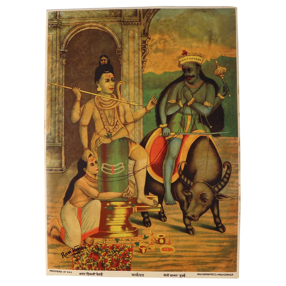 This paper print Raja Ravi Varma shows Lord Shiva saving his devoted follower Markandeya, who is scheduled to pass away on his sixteenth birthday. However, Markandeya's prayers cause the Lord to emerge from the Shiva linga and halt the death deity Yama. One of the significant immortals in Hindu mythology is Markandeya. As the years passed, the fateful day—his 16th birthday—came when Yama, the god of death, came to take the boy's life. Markandeya was pleading with Lord Shiva when Yama threw his noose, encircling both the Shiva Ling and Markandeya. An enraged Shiva emerged from the Shiva Linga, and Yama became frightened. All the gods trembled and came to appease Shiva and protect Yama.