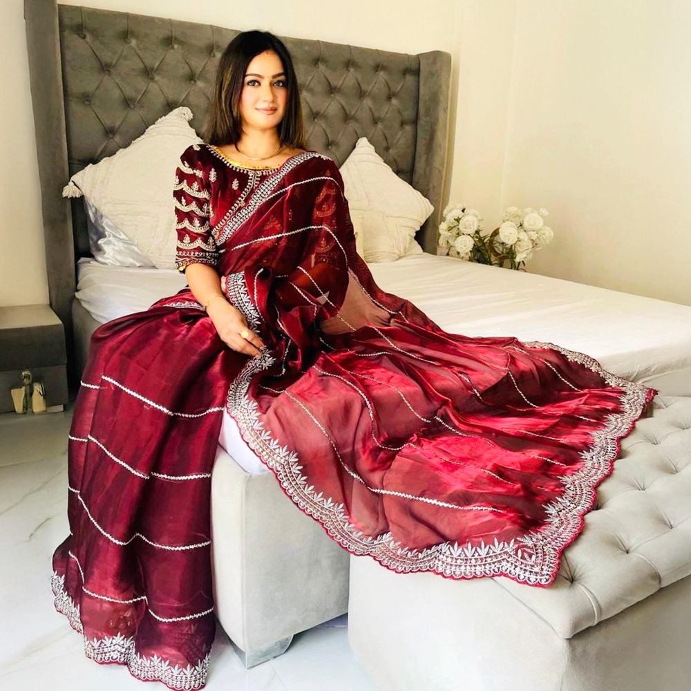 Celebrate bridal elegance with this luxurious Bollywood-style saree in pure organza silk, drenched in a deep maroon hue that radiates royalty. The saree features delicately embroidered diagonal silver threads across the translucent body, creating a graceful shimmer that catches the light with every step. The intricately hand-embroidered scalloped zari border adds definition and grandeur, perfectly framing the flowing silhouette. Its sheer yet structured fabric drapes beautifully, making it ideal for bridal trousseau, wedding receptions, or traditional festivities. The maroon shade symbolizes love and strength—ideal for a bride or wedding guest looking to make a regal impression. Pair it with a heavily embroidered blouse, kundan jewelry, and bold makeup for a complete bridal look.