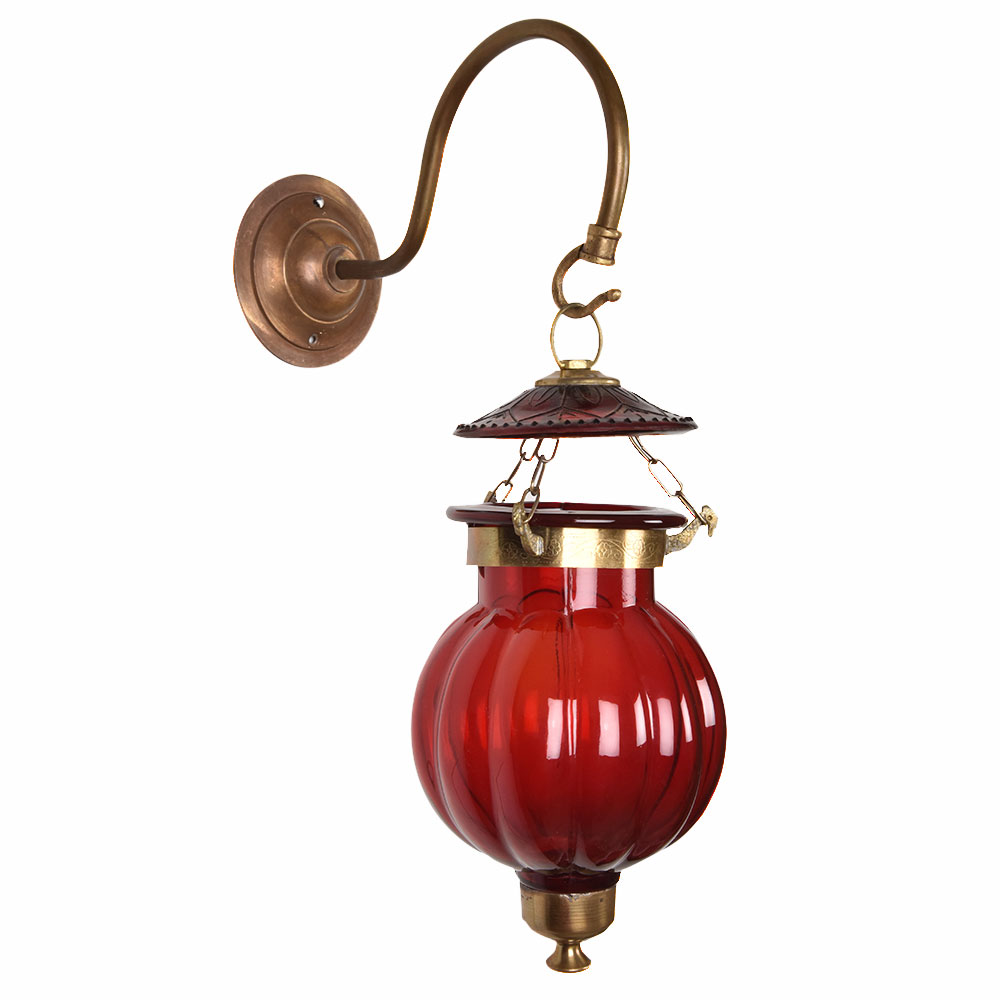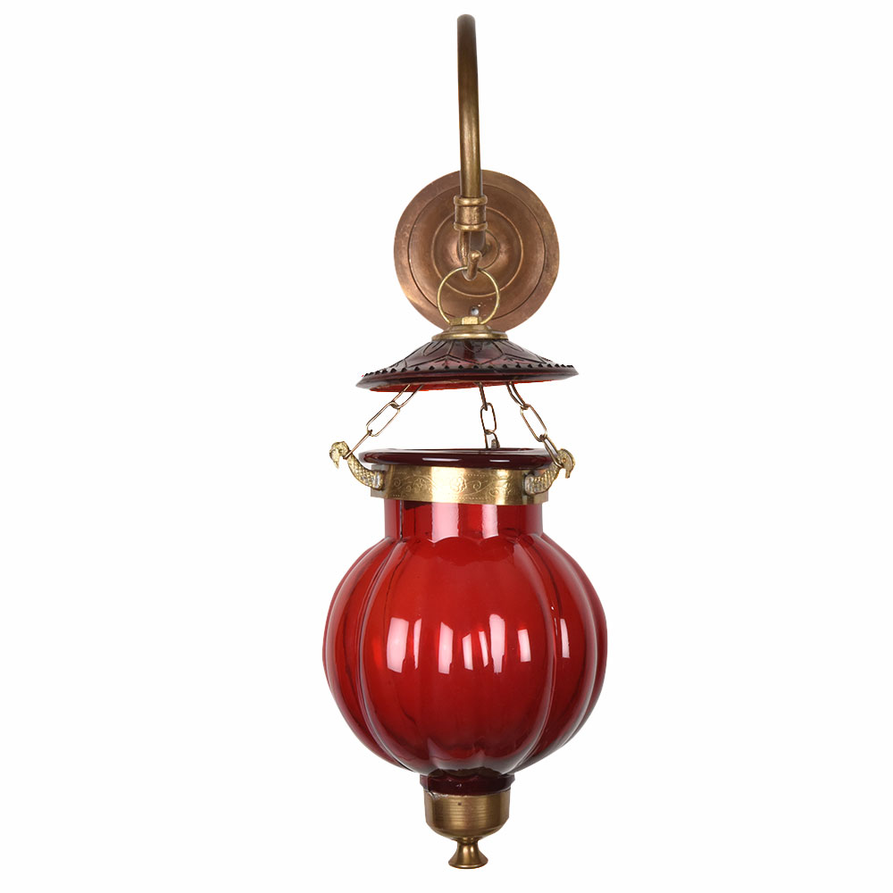 Maroon pumpkin shaped glass hanging on bronze bracket. The lamp is unique and allows a great lighting option for any room.