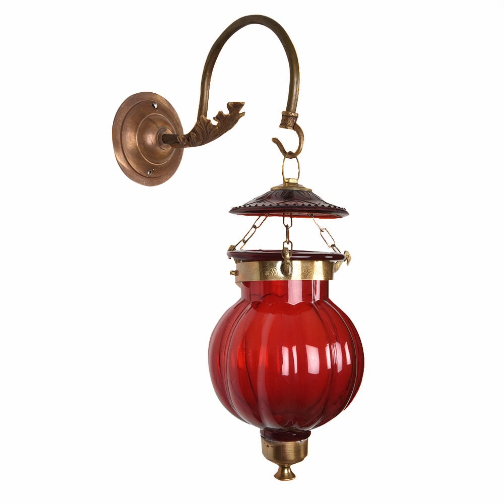 Maroon pumpkin shaped glass hanging lamp on leafy bronze bracket. The lamp is unique and allows a great lighting option for any room.