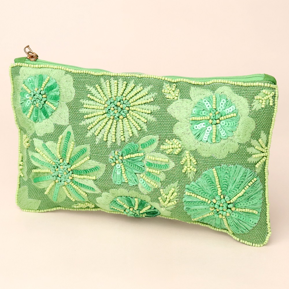 Step into springtime elegance with this exquisite hand-beaded pouch adorned with floral embroidery in soft green tones. Delicate sequins and textured threadwork form radiant blossom motifs that add charm and sophistication to your accessory game. Compact yet stylish, this pouch is perfect for carrying your daily essentials with artisanal flair.