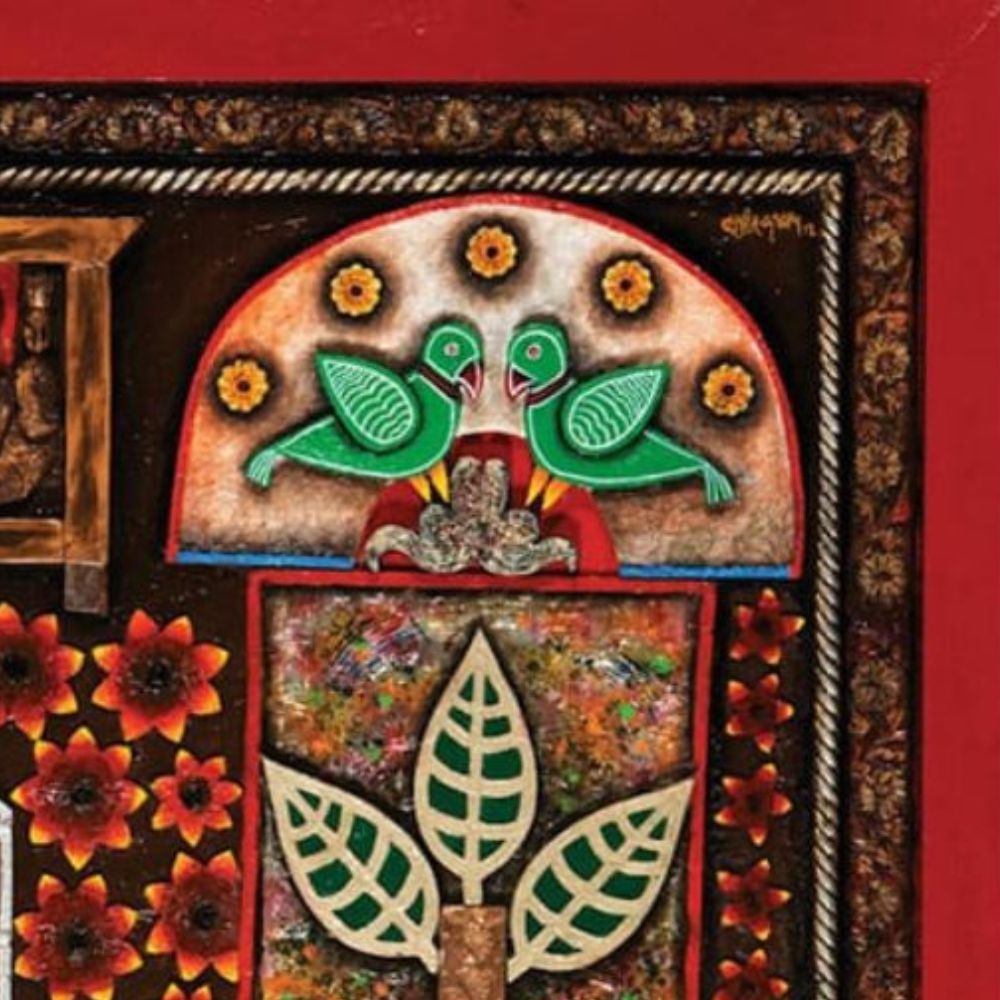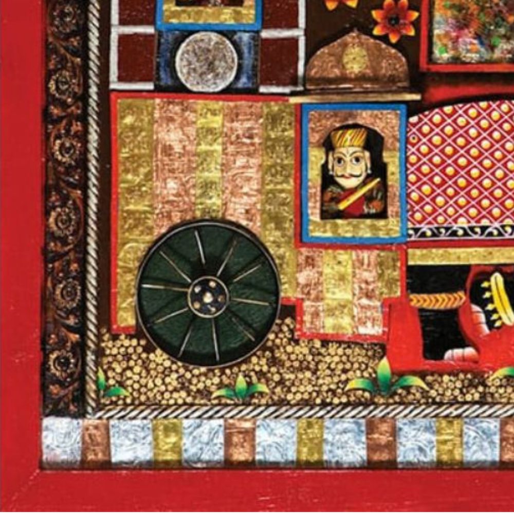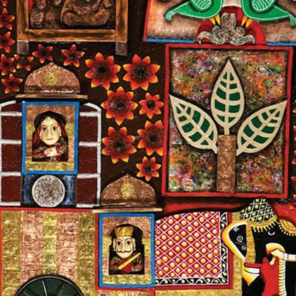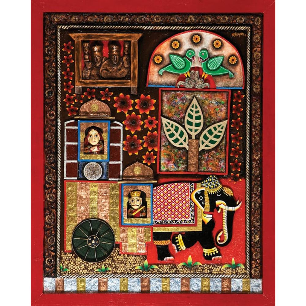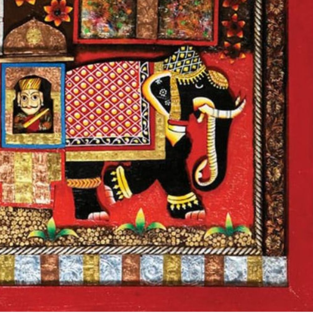 "Mewari Jharokha" is a stunning Oil and Acrylic on Mix Medium board painting that beautifully captures the essence of Rajasthan’s royal heritage and architectural splendor. Weighing around 40 kg and crafted with dimensions of Height – 60 inches, Width – 48 inches, and Length – 4 inches, this masterpiece is a grand statement of tradition, artistry, and culture. The painting presents an intricately detailed composition inspired by Mewari jharokhas - ornate windows that symbolize hospitality, pride, and aesthetic richness in Rajasthani palaces. Figures peering through painted windows represent daily life, storytelling, and royal traditions, while the elaborately decorated elephant conveys festivity, power, and prosperity. The artwork is further enhanced with motifs of peacocks, trees, and floral embellishments, each carrying symbolic meaning of fertility, love, and abundance. Created with oil and acrylic on a textured board surface, the painting exhibits a striking three-dimensional appeal that blends depth with vibrancy. Its bold use of reds, golds, greens, and blacks conveys a regal aura, making it an ideal choice for art collectors, luxury interiors, and cultural spaces. More than décor, "Mewari Jharokha" is a timeless tribute to India’s artistic legacy.