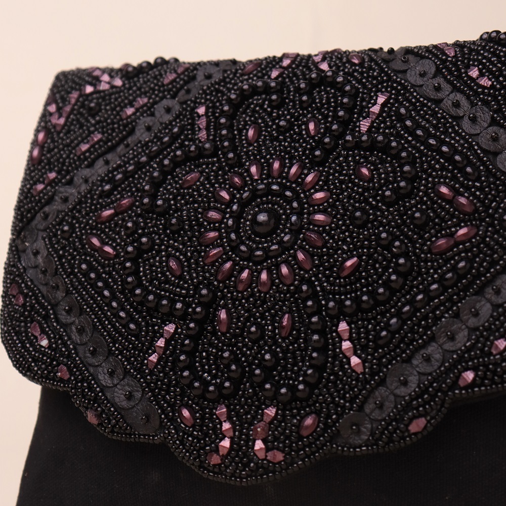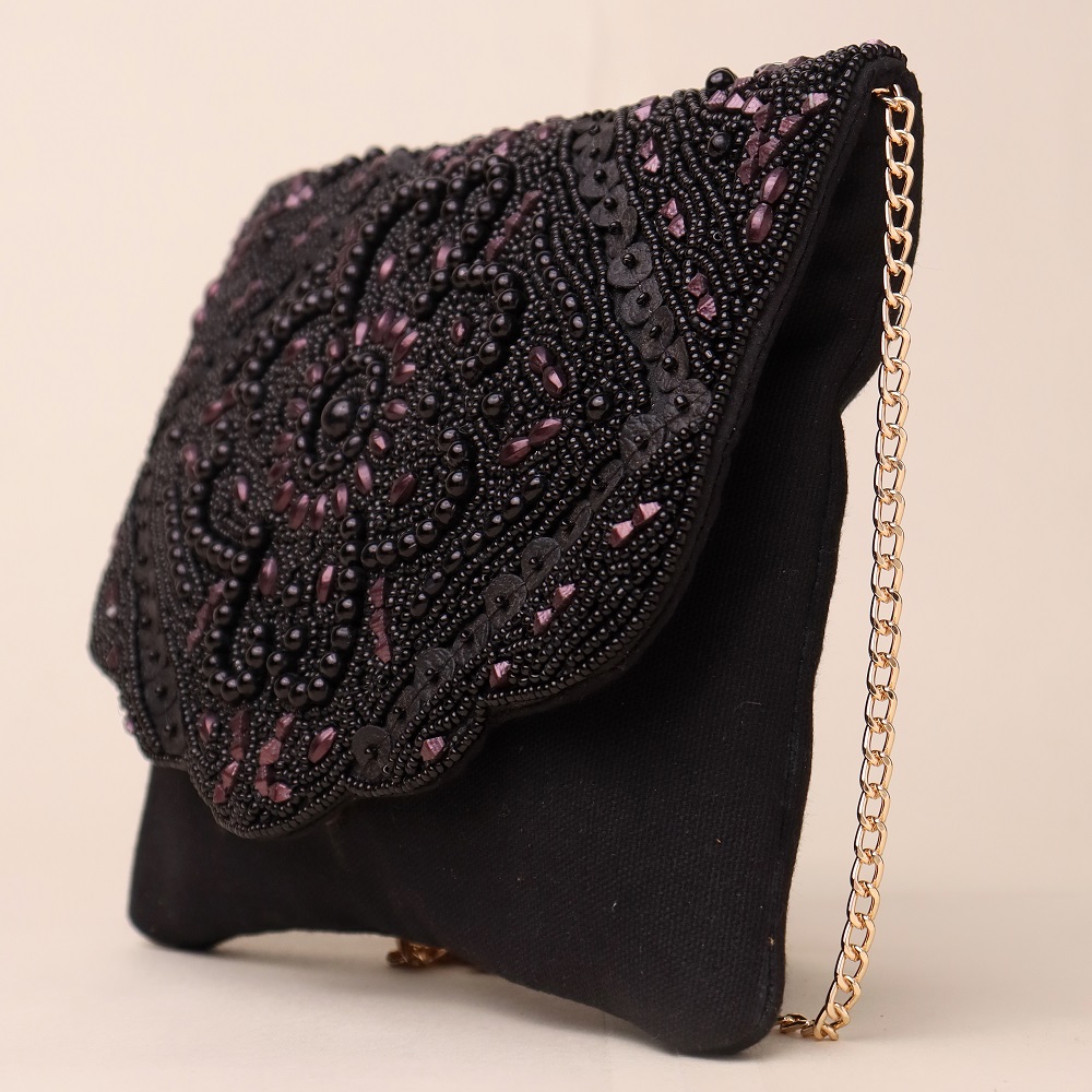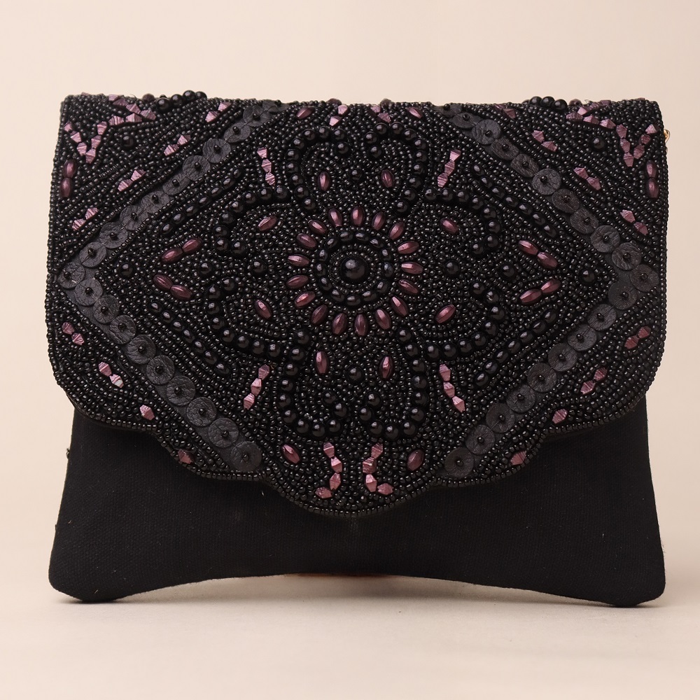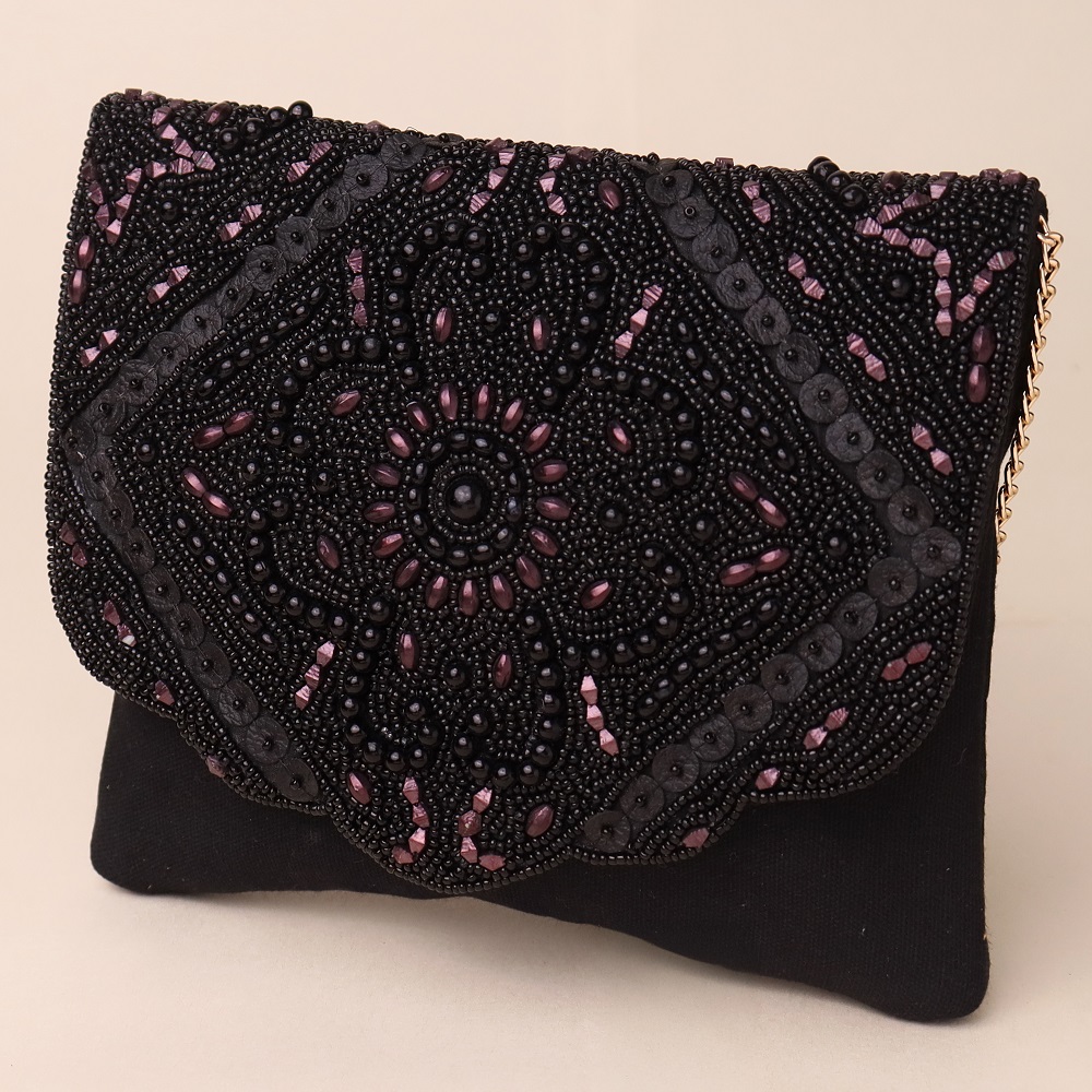 Elevate your evening attire with this exquisite hand-beaded clutch featuring a floral medallion motif and scalloped flap. The delicate beading creates a dramatic texture that catches the light with subtle shimmer. Whether you're headed to a cocktail soirée or a festive gathering, the detachable chain strap offers versatile styling to suit your mood—carry it as a crossbody or in hand as a classic clutch.