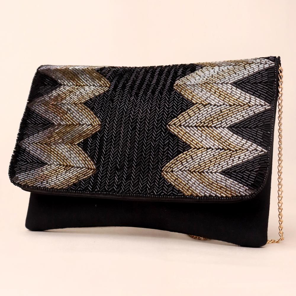 Step into the spotlight with this captivating hand-beaded clutch that marries bold design with refined craftsmanship. The chevron pattern dances across the surface in a dramatic arrangement of metallic tones, making it an ideal accessory for cocktail evenings, weddings, or high-glam events. Finished with a sleek silhouette and a detachable chain strap, it offers both flair and functionality.