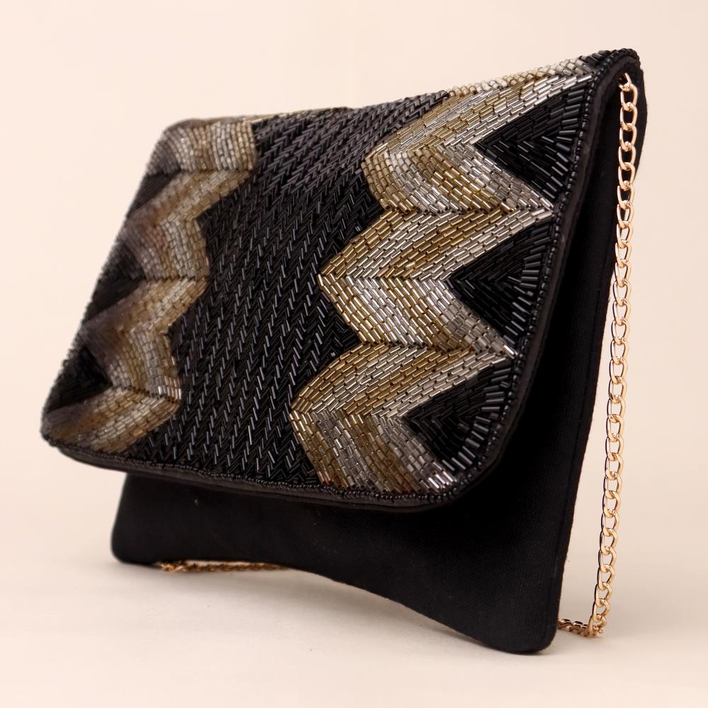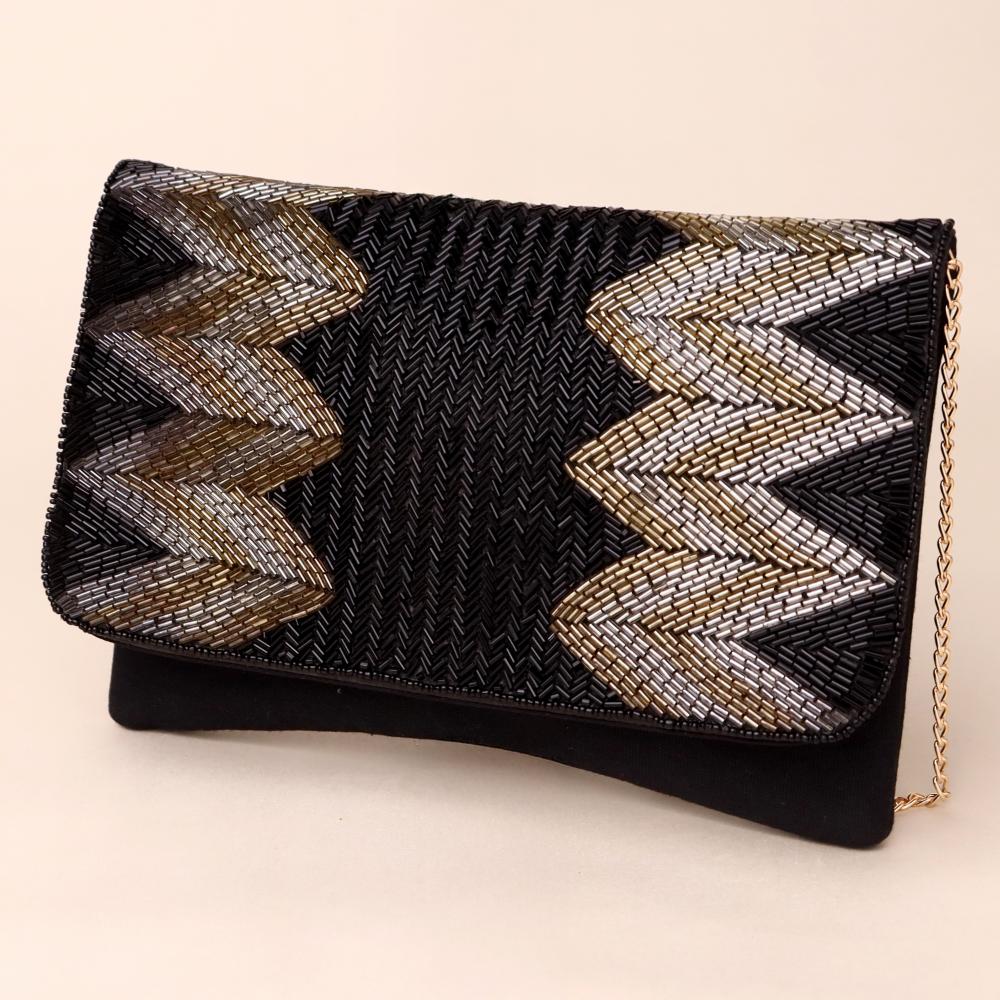 • Midnight Chevron Luxe Hand-Beaded Clutch with Chain Strap