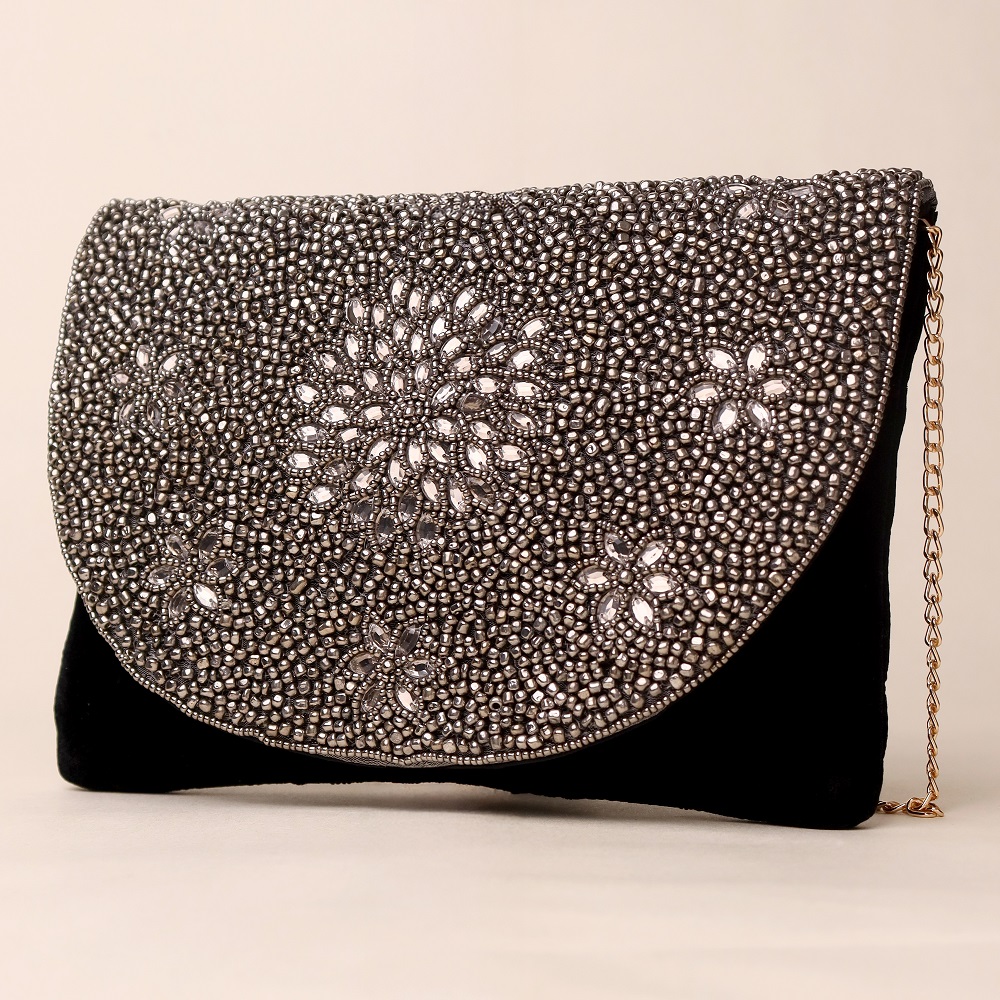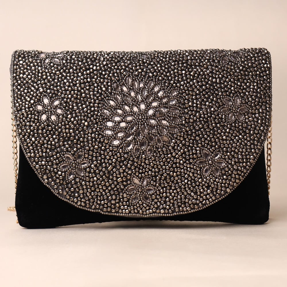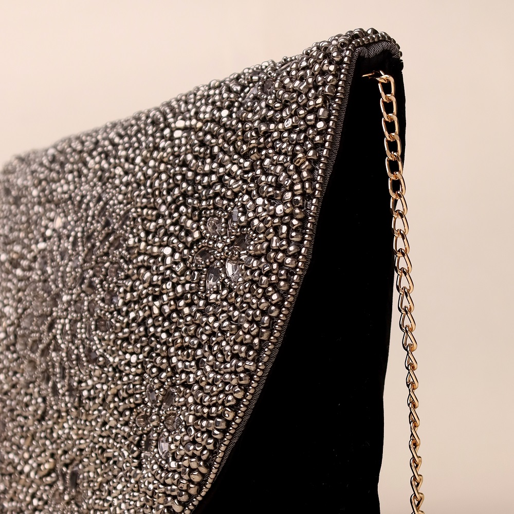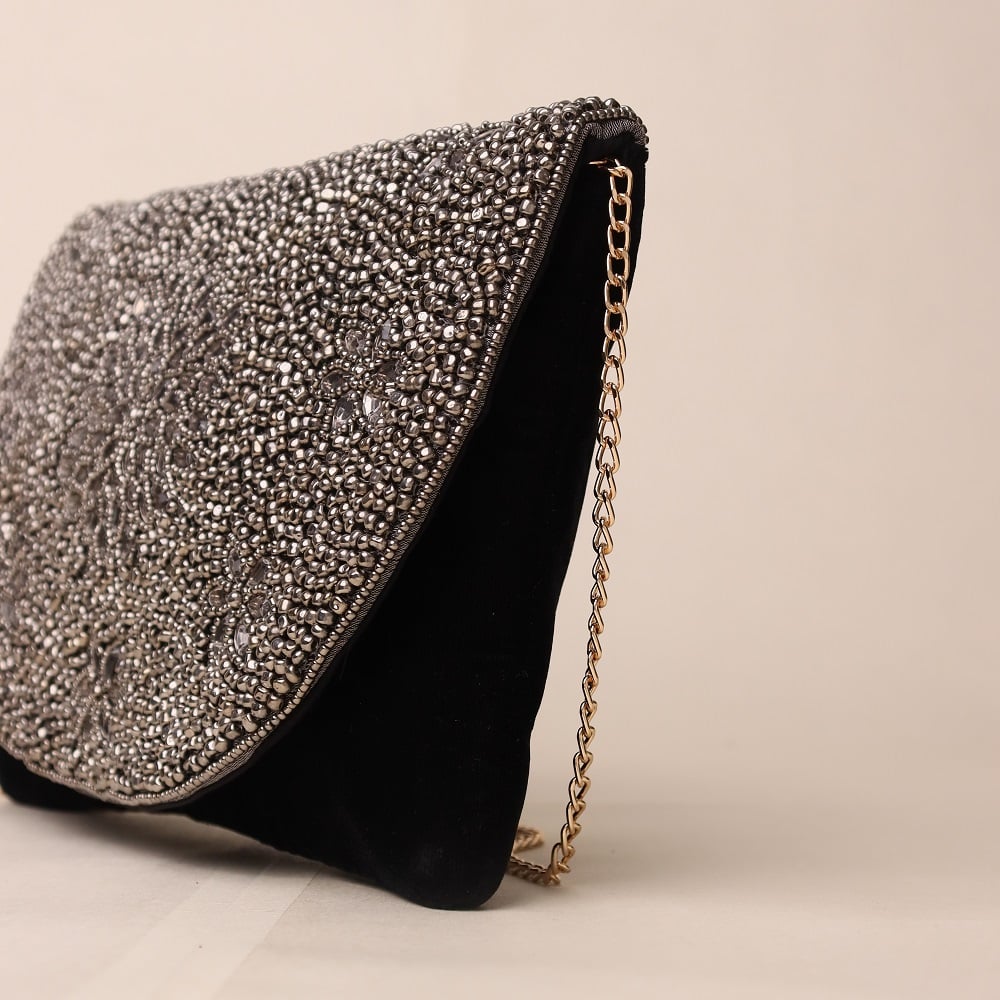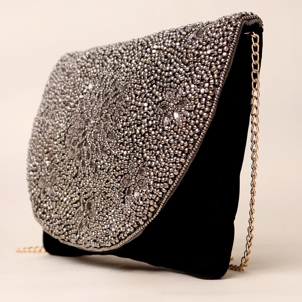 Exude timeless glamour with this exquisite hand-beaded sling bag adorned with intricate floral patterns in metallic silver and black. The curved flap is meticulously embellished with premium beads, creating a shimmering effect that catches every light. Designed with a detachable gold-tone chain strap, this versatile piece can be styled as a crossbody for modern chic or carried as a clutch for elegant evenings. Perfect for weddings, cocktail nights, or any occasion that calls for a touch of luxury.