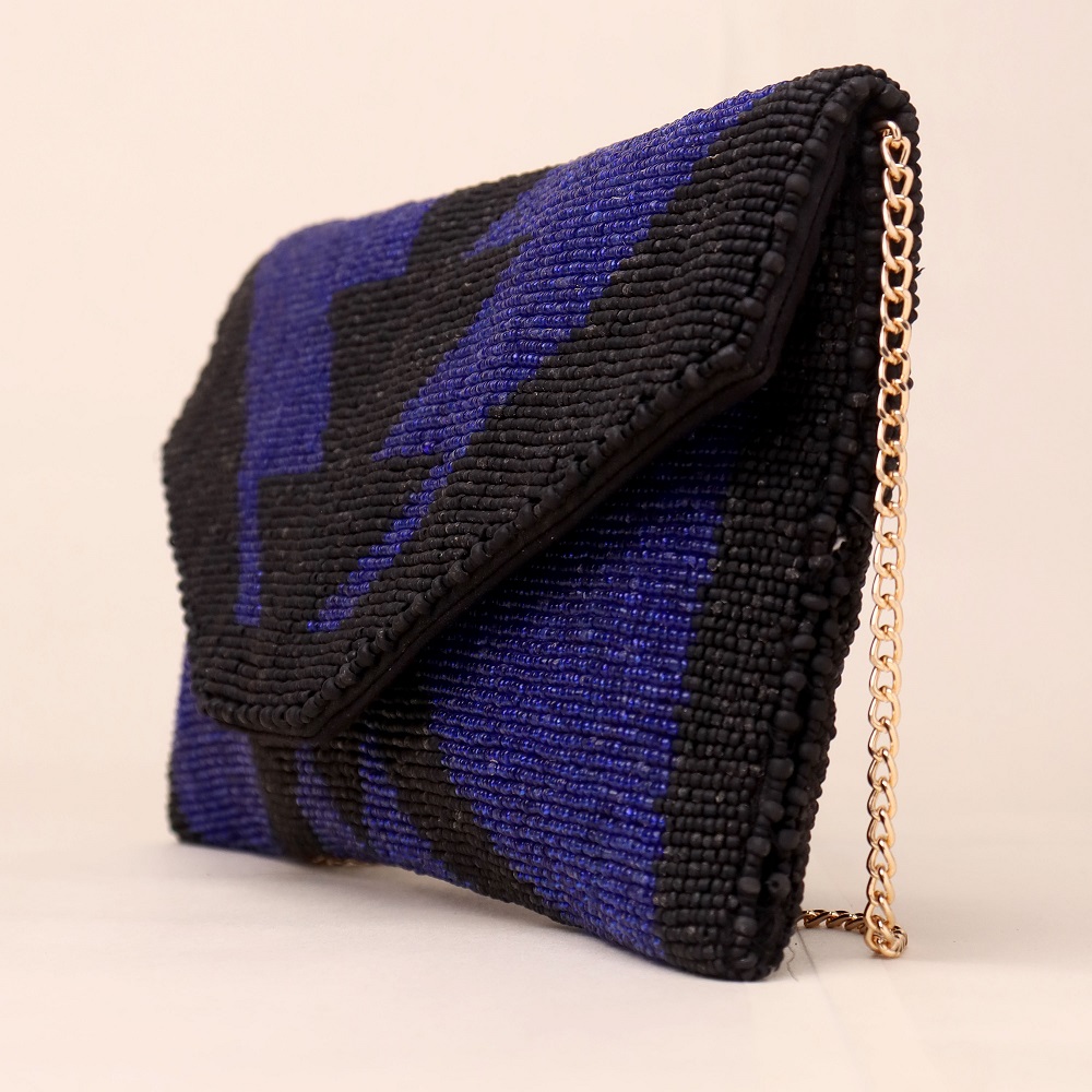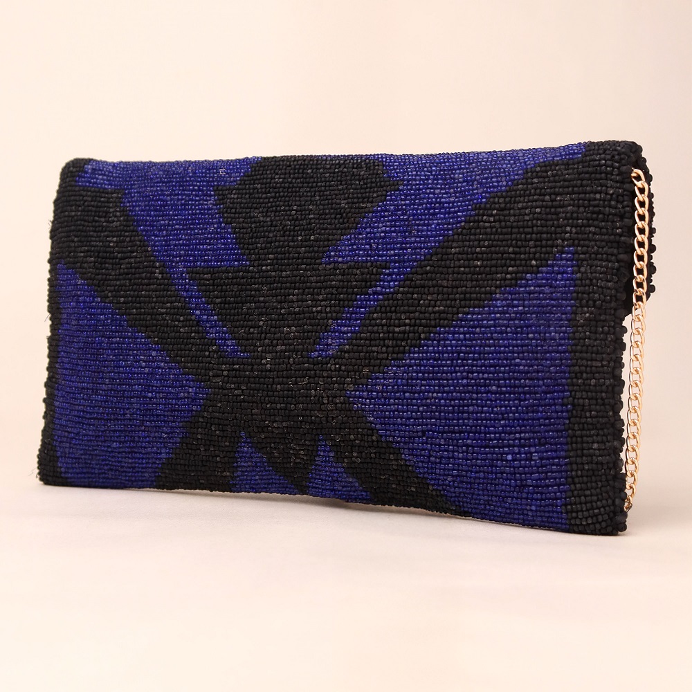 Unleash your bold side with this striking hand-beaded clutch featuring a dramatic geometric pattern. The sharp contrast and precision beading create a powerful visual statement, making it a perfect pick for after-dark glamour. Designed with a structured envelope flap and complemented by a detachable chain strap, this clutch offers both fierce style and functional ease for cocktail nights, art shows, or festive evenings.