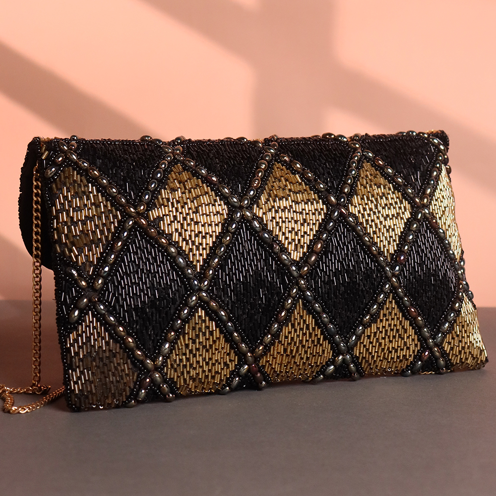 Step into the spotlight with the Midnight Glam Beaded Clutch — a striking blend of sophistication and sparkle. Crafted with intricate black and gold beadwork in a lattice-style diamond pattern, this clutch features unique scalloped edging and a radiant sheen that makes it ideal for evening glamour. The gold-toned chain strap offers versatility for hands-free carry at weddings, receptions, or cocktail events.Designed for the modern diva who loves timeless elegance with a bold twist, this clutch is the perfect accessory to elevate any festive or formal look.