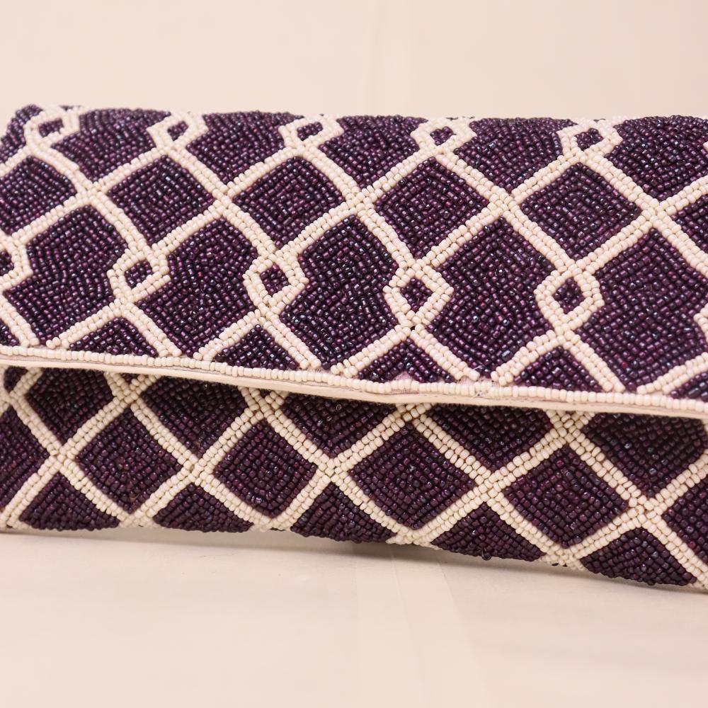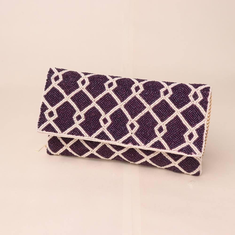 Midnight Lattice Hand-Beaded Clutch with Detachable Chain Strap