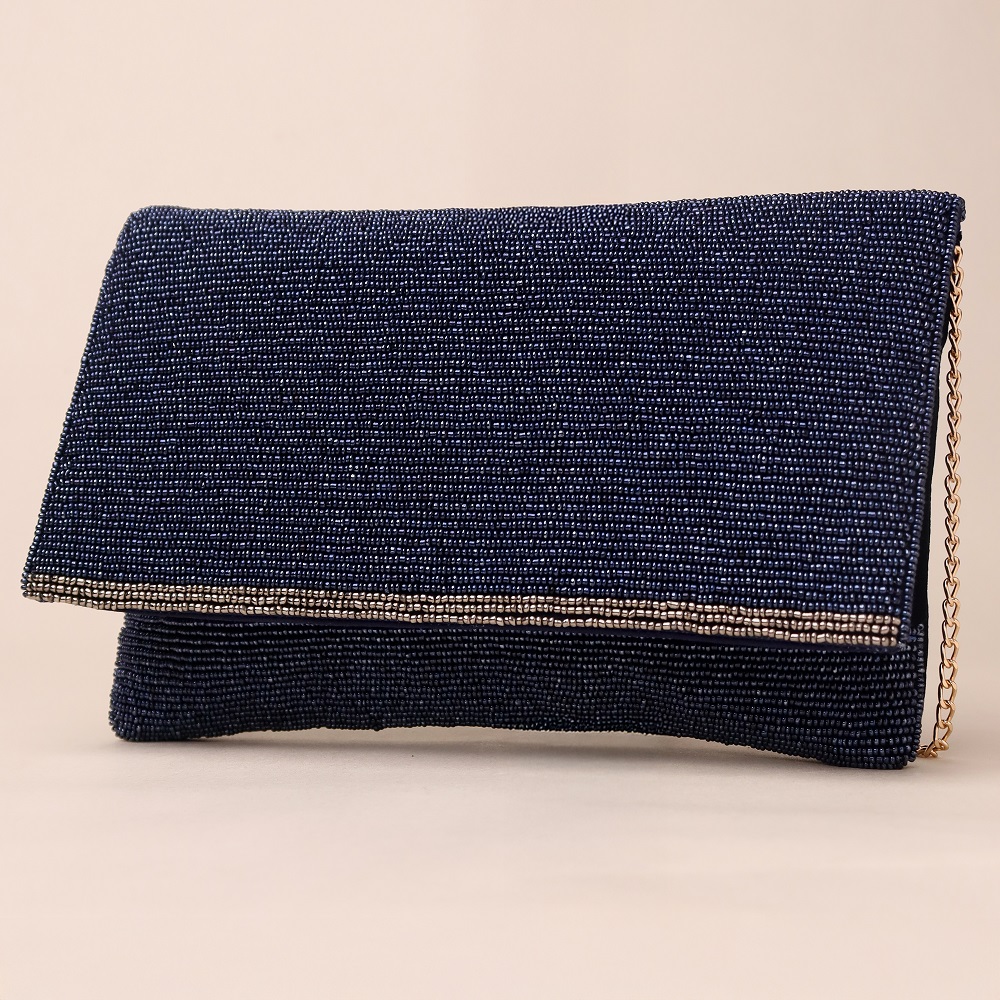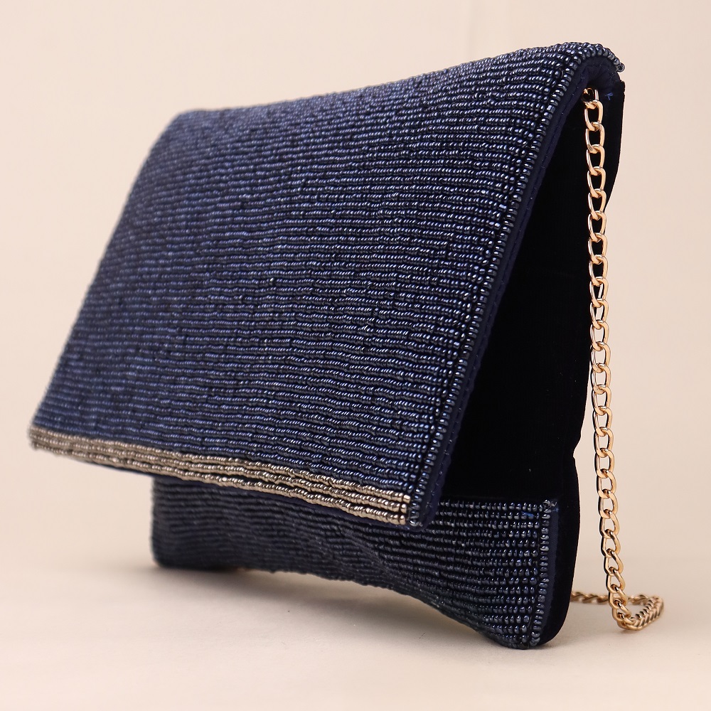 Refined elegance meets timeless design with this midnight blue hand-beaded sling bag. Adorned with meticulous glass beadwork, it exudes sophistication while maintaining a minimalist appeal. The envelope flap is accented with a subtle silver bead border for a touch of shimmer. Complete with a detachable gold-tone chain strap, this versatile accessory can be worn as a crossbody, shoulder bag, or carried as a sleek clutch for evening events.