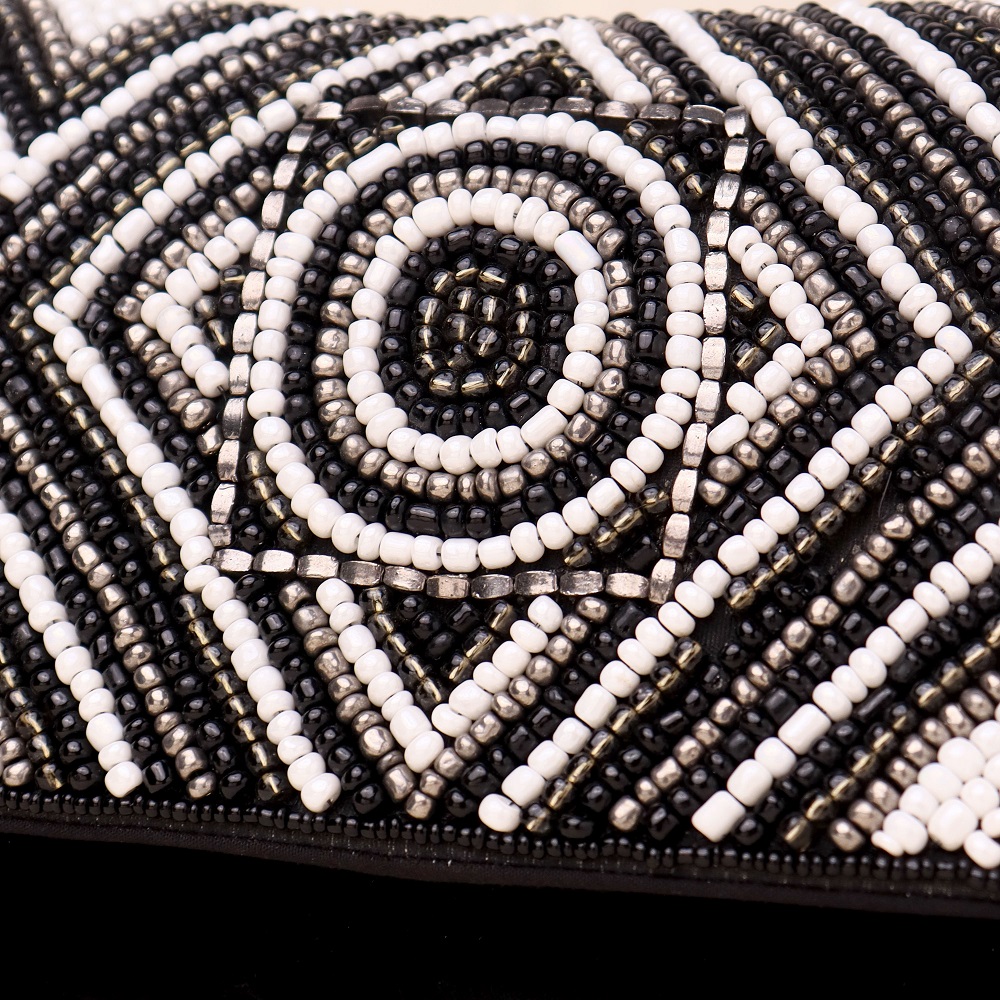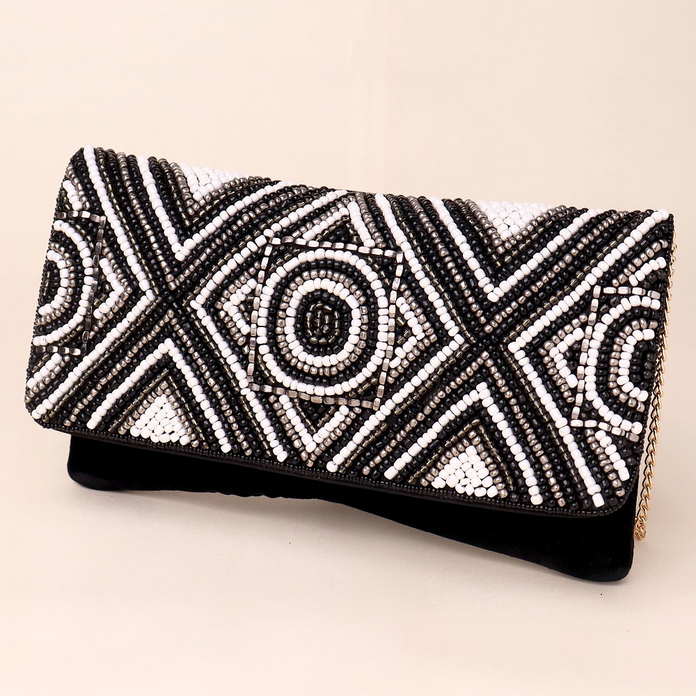 Midnight Monochrome Hand-Beaded Geometric Clutch with Chain Strap