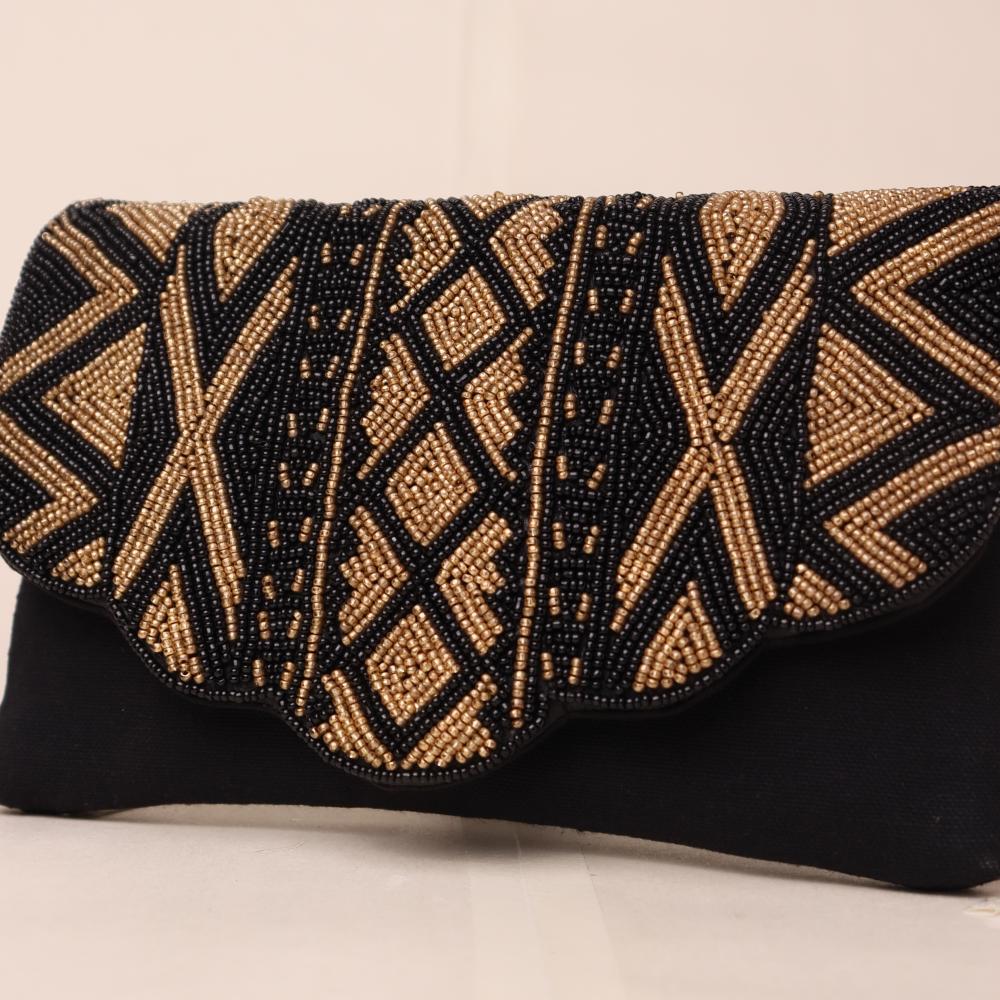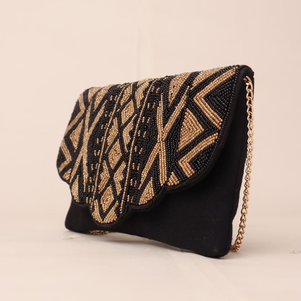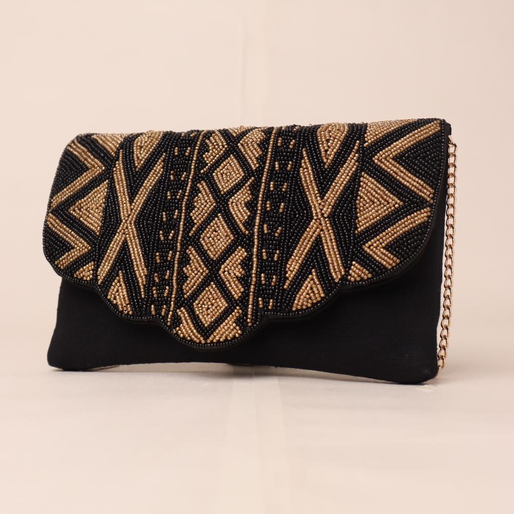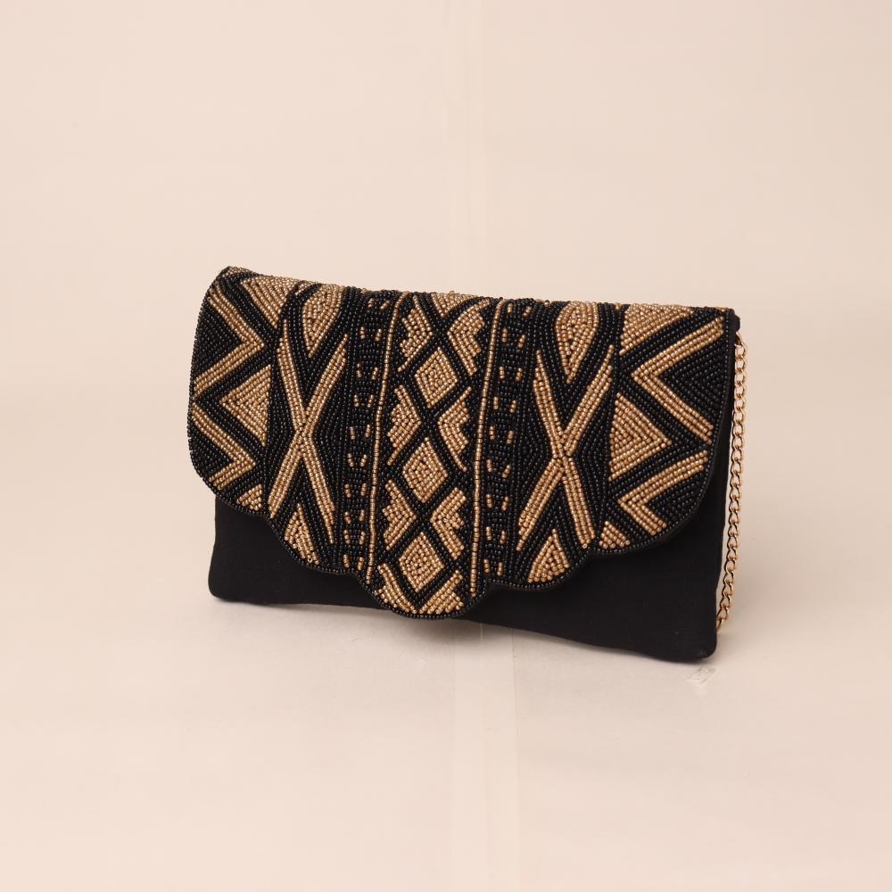 Step into elegance with the Midnight Muse Beaded Clutch — a striking accessory that blends tribal-inspired patterns with refined craftsmanship. The ornate beadwork on the scalloped flap creates a bold visual statement, making this clutch a standout piece for evening soirées, cocktail parties, or festive occasions. The gold-tone chain strap adds versatility, allowing it to be styled as a shoulder bag when needed.