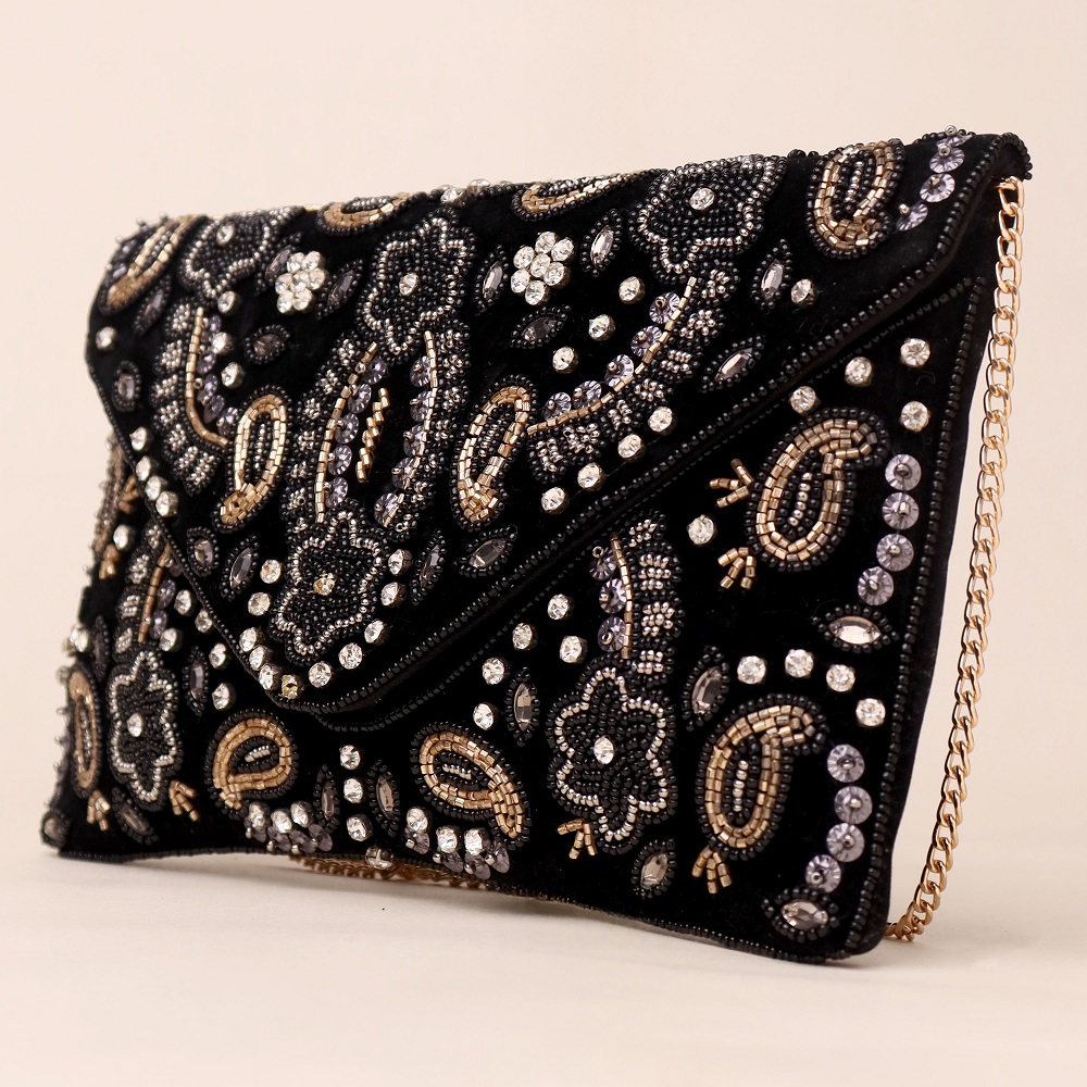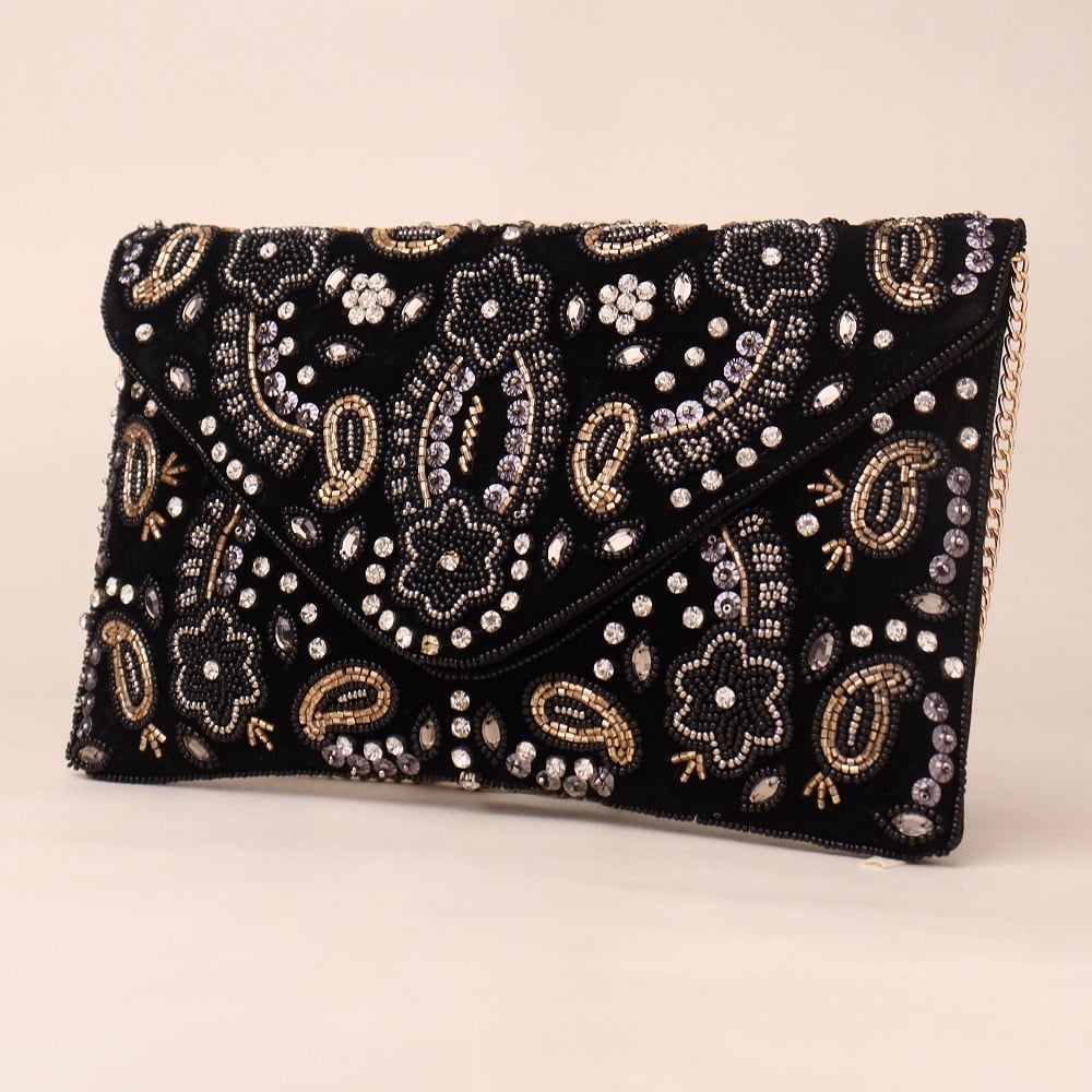 Add a touch of regal elegance to your ensemble with the Midnight Paisley Beaded Velvet Clutch. Crafted on a deep black velvet base, this envelope-style clutch is adorned with intricate paisley and floral motifs, meticulously hand-embroidered using shimmering beads, sequins, and mirror embellishments. The rich embellishment is paired with a detachable gold chain strap, offering you both style and functionality—wear it on the shoulder or carry it as a handheld clutch for special evenings.