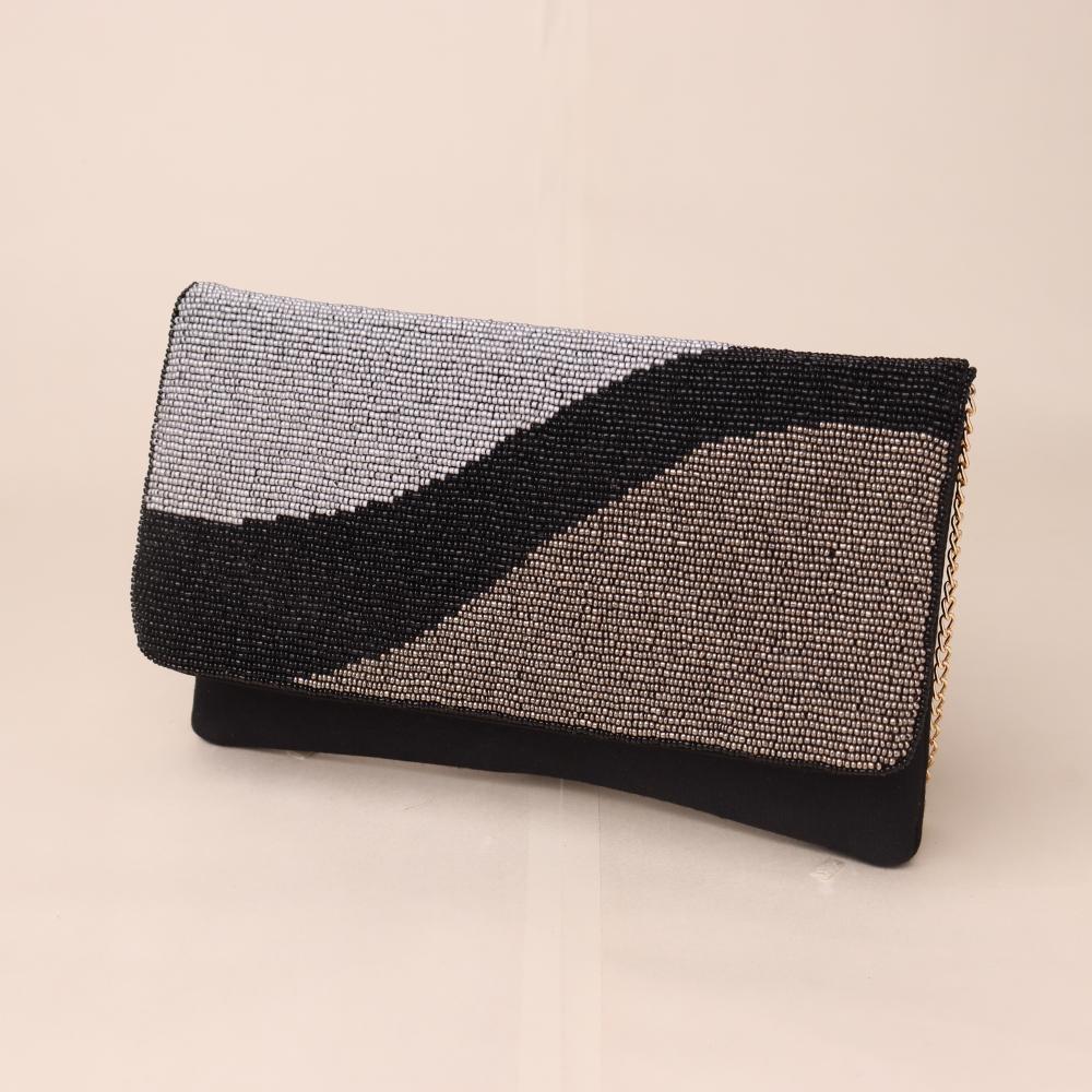 Step into timeless sophistication with this handcrafted beaded clutch, featuring a captivating wave-like pattern in monochrome tones. Designed for evenings that demand elegance, this clutch blends artistic finesse with practicality. The detachable metallic chain strap adds effortless versatility—carry it crossbody, on the shoulder, or as a refined handheld piece.
