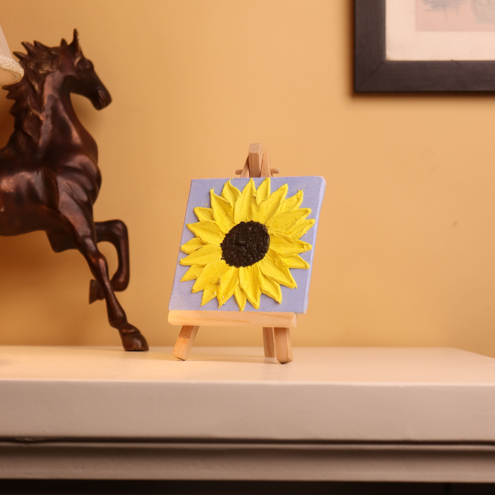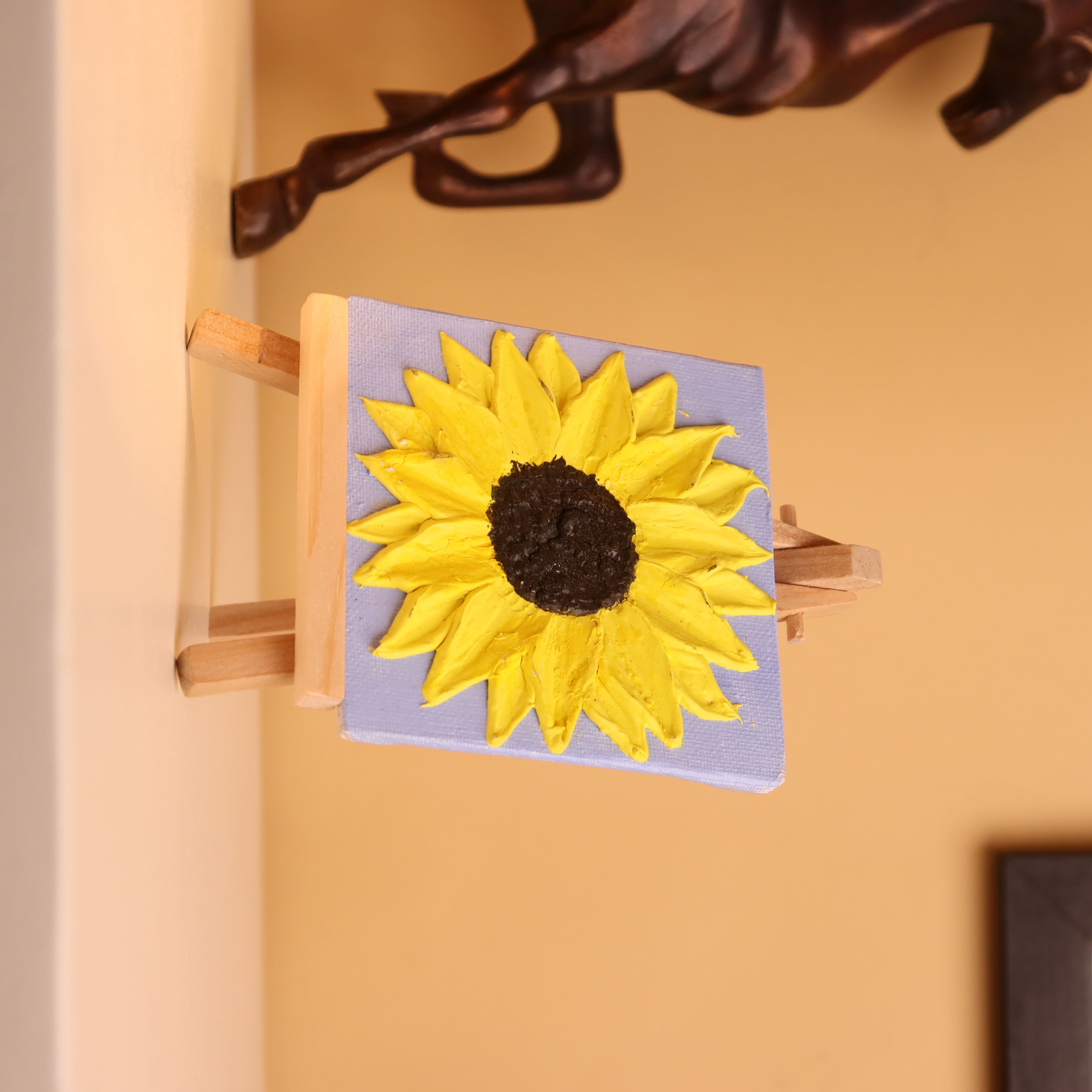Celebrate the charm of nature with this delightful 4x4 inch handcrafted canvas painting featuring a radiant sunflower brought to life with raised, three-dimensional texture. Made using high-quality textured acrylic paint, the bold yellow petals are sculpted to add depth and dimension, making the flower visually pop against a soft lavender-blue background. The dark, richly textured center creates striking contrast and gives the sunflower its iconic look. This miniature artwork comes with a sturdy wooden easel, making it a perfect accent for desks, bookshelves, or cozy decor corners. Whether you’re gifting a nature lover or adding a splash of cheerful art to your own space, this piece radiates warmth and sunshine in every petal. Each painting is uniquely handmade with love and artistic detail, ensuring no two are ever alike.