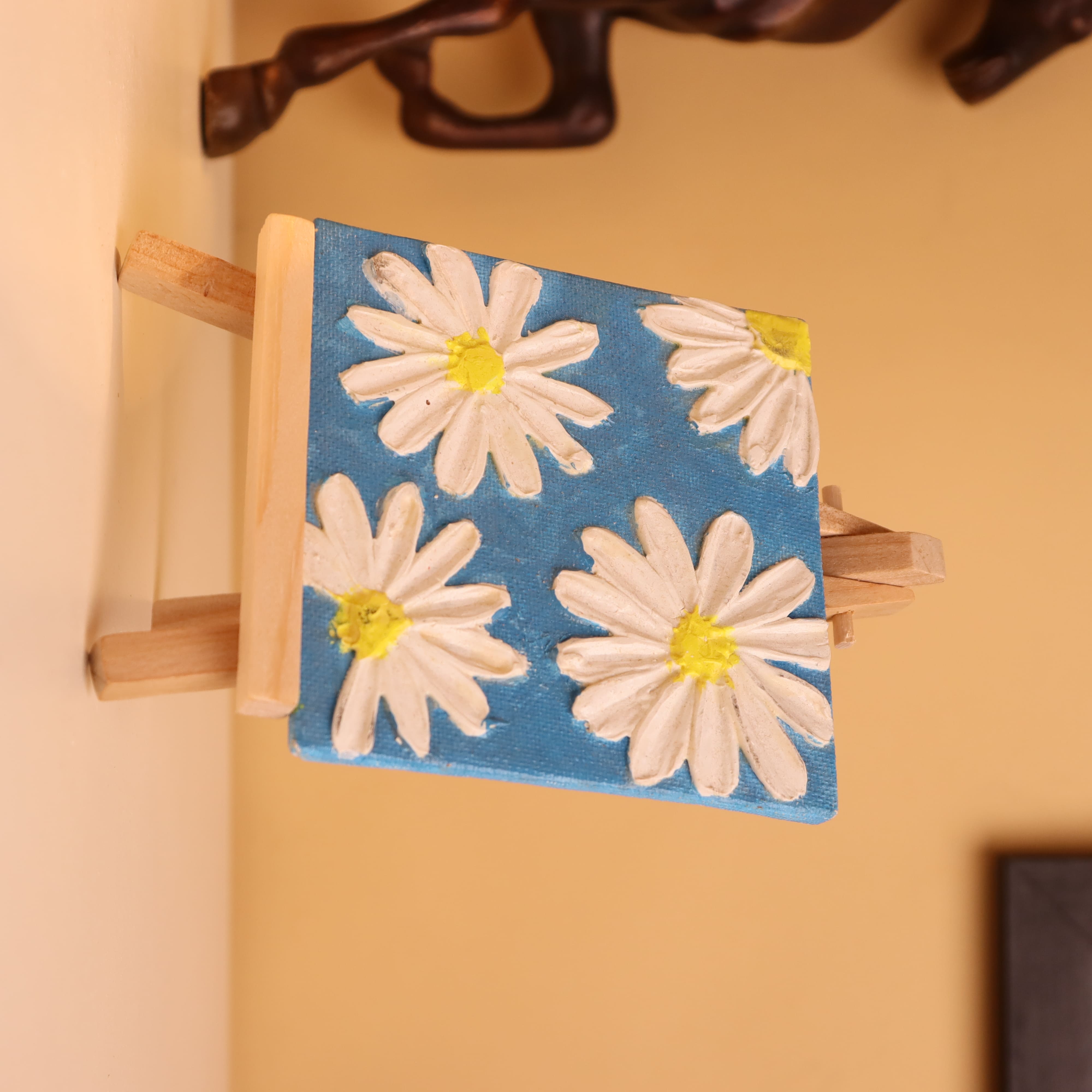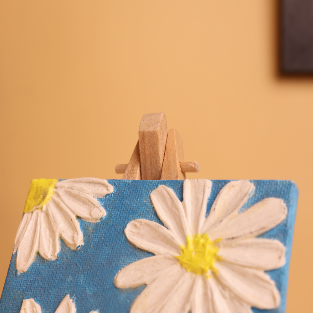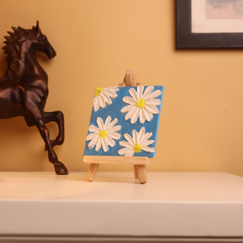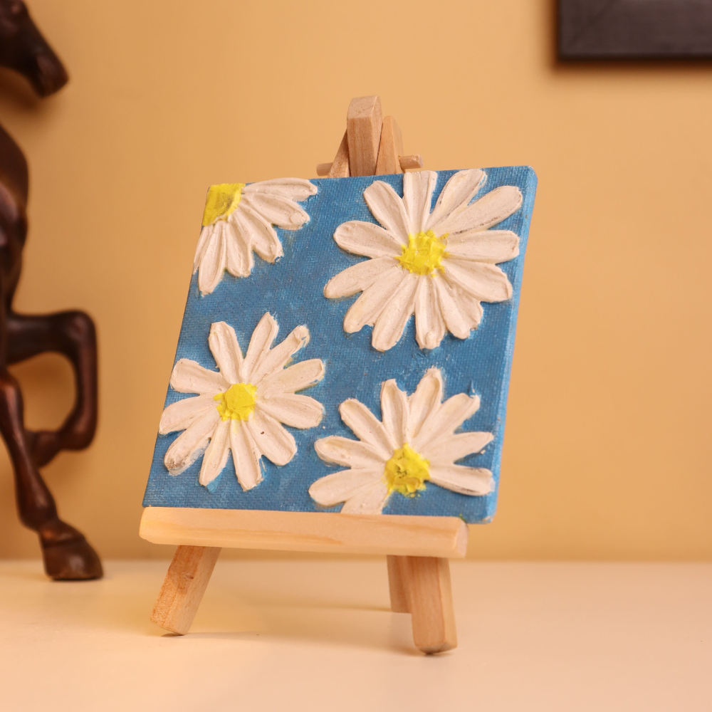 Add a splash of freshness and cheer to your space with this 4x4 inch textured canvas painting, featuring delicate white daisies blooming over a vivid blue background. Each petal is carefully hand-painted using thick, high-relief textured paint, giving the flowers a raised, three-dimensional effect that you can see and feel. The daisy centers are bright yellow, creating a sunny contrast against the cool blue backdrop, making this mini artwork perfect for brightening shelves, desks, or any cozy corner. Ideal for gifting, this petite floral painting comes mounted on a wooden easel for instant display. Whether you're a nature enthusiast or simply love vibrant, handcrafted decor, this piece brings the feel of a joyful spring day into your home. Its compact size and bold color palette make it a standout accent that fits effortlessly into modern, boho, or cottagecore aesthetics. Handmade with textured charm, it's a flowerful delight in every brushstroke.