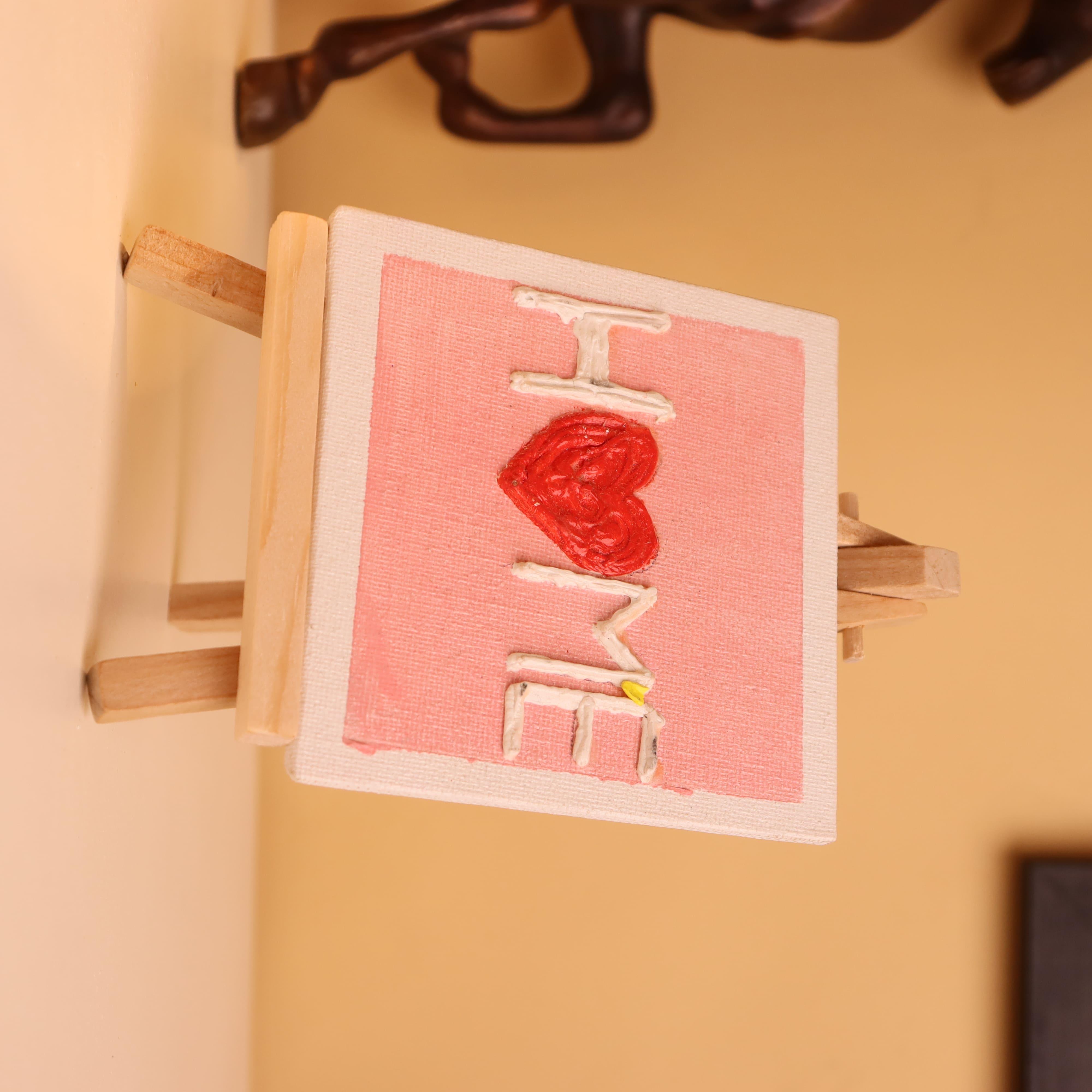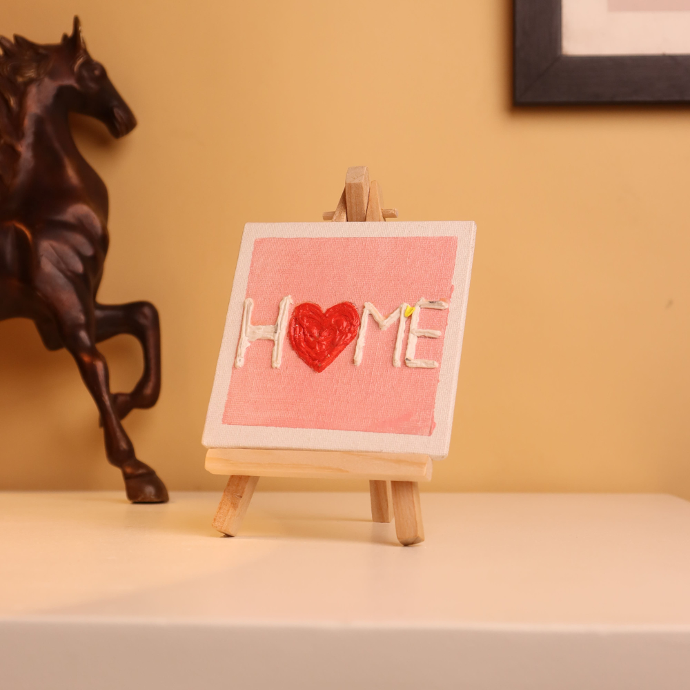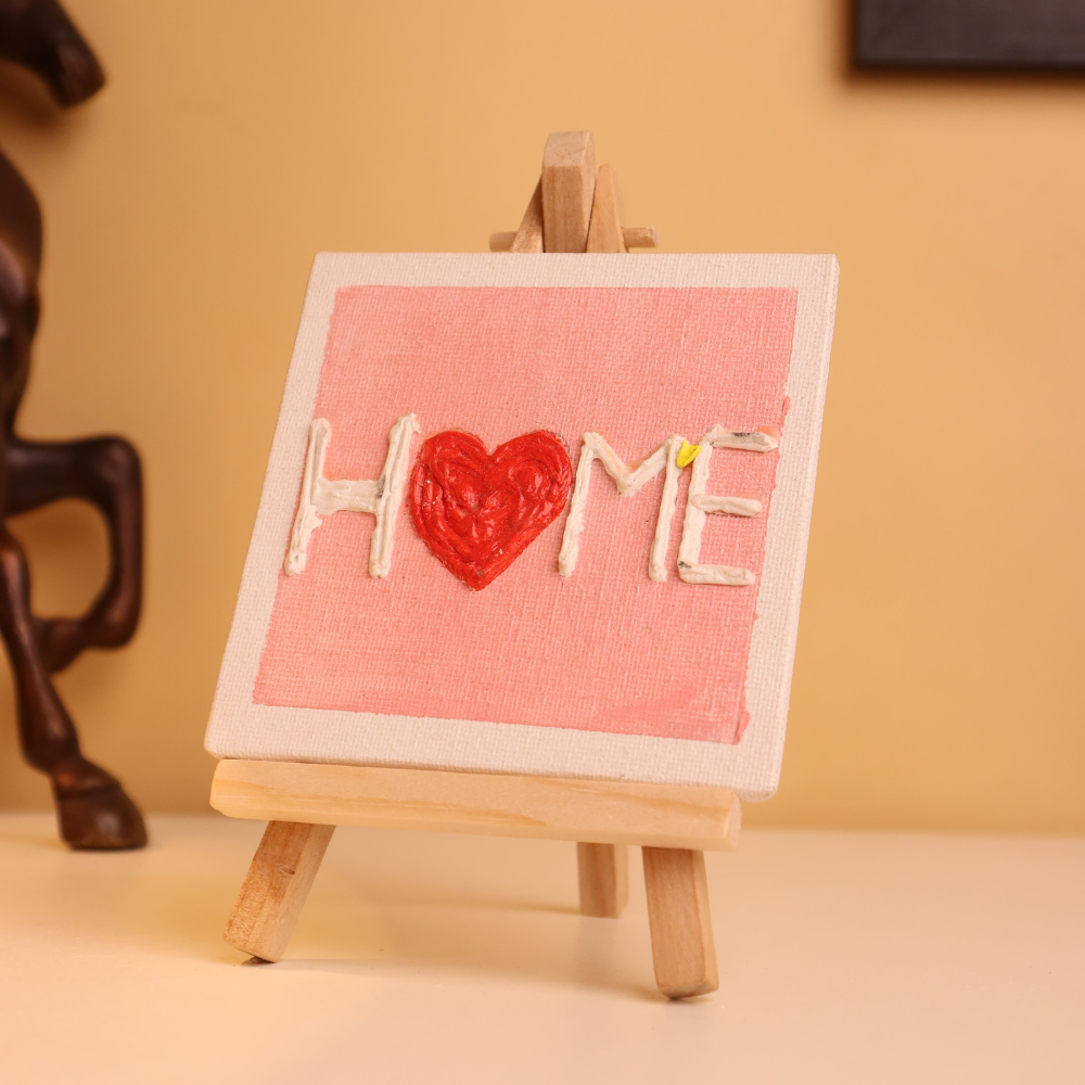 Infuse your space with warmth and affection through this handcrafted 4x4 inch canvas painting that spells out “HOME” with a loving twist. Designed on a soft pink backdrop and framed in white, the piece replaces the “O” with a raised, textured red heart that instantly draws the eye and touches the heart. Each letter is carefully crafted using thick textured paint to create a dimensional effect you can see and feel. The vibrant red heart symbolizes the love and comfort that make a house truly a home. Mounted on a mini wooden easel, this artwork is ready to display on desks, bookshelves, bedside tables, or kitchen counters—anywhere that needs a little extra cheer. This compact canvas is not only a charming decorative piece but also a heartfelt gift for loved ones, newlyweds, or housewarming occasions. Add a personal, cozy statement to your décor with this joyful little tribute to love and home.