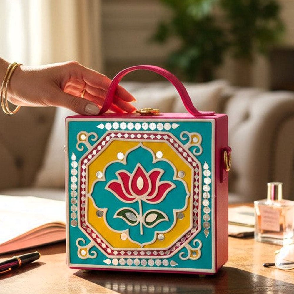 This mini sling box bag showcases lotus inspired Lippan art that blends tradition with modern style. Its compact box form and mirrored details make it appealing to collectors decorators and gifters alike. Each piece is handcrafted by skilled artisans and packed and quality checked by Indianshelf.