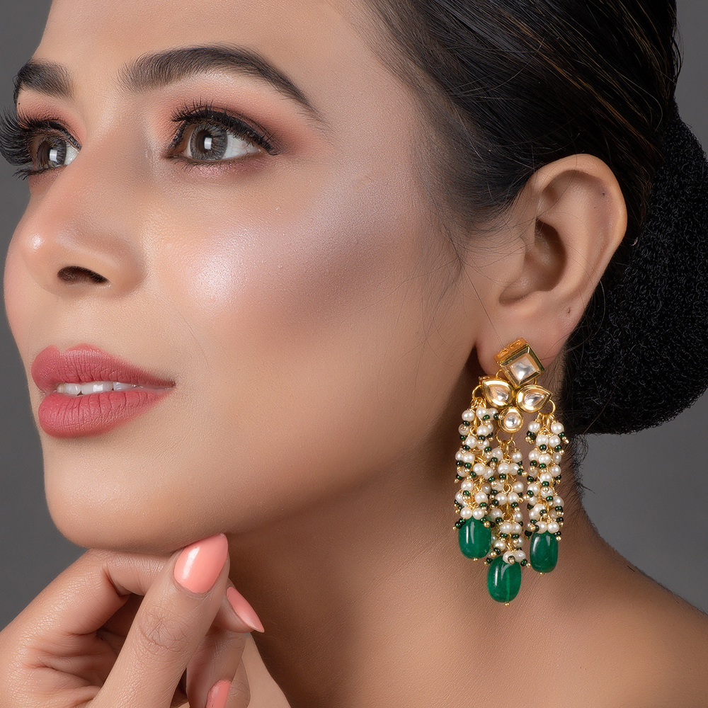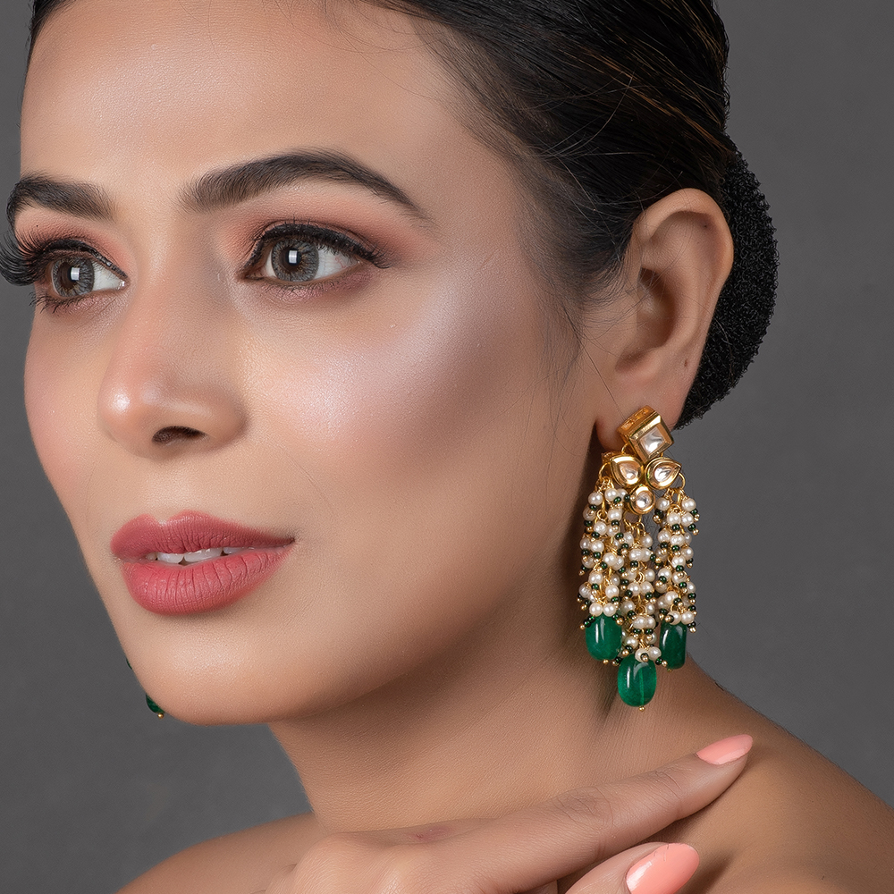 These earrings combine mirror-cluster motifs with elegant pearl and green bead tassels, handcrafted to offer a distinctive balance of classic and vibrant elements.