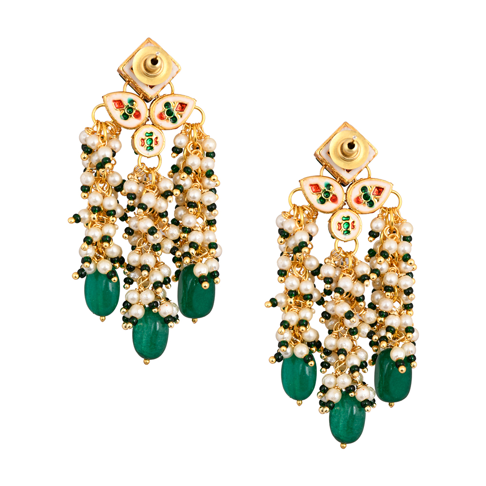These earrings combine mirror-cluster design with pearl strands and green bead drops, offering a sophisticated yet vibrant accessory for both traditional and contemporary styles.