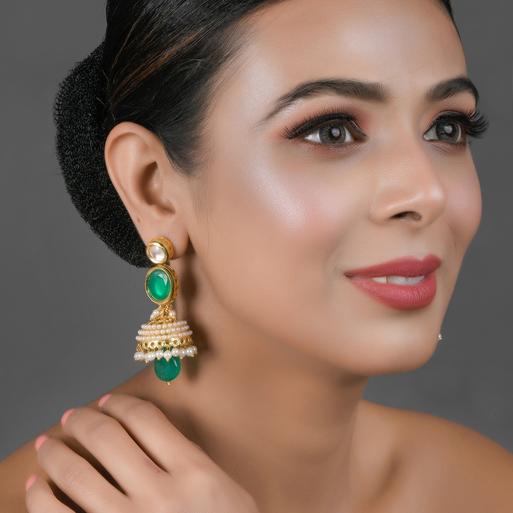 The Mirror & Green Stone Jhumka Earrings with Pearl Dome Pair captures traditional Indian jewelry artistry in a refined 3.10-inch silhouette. Crafted in brass with a radiant gold tone finish, these earrings feature mirror elements paired with vibrant green stone accents. The structured pearl dome adds dimension and soft luminosity, while the overall jhumka form brings ceremonial elegance. Designed to move beautifully, they offer festive richness without overwhelming the ensemble.