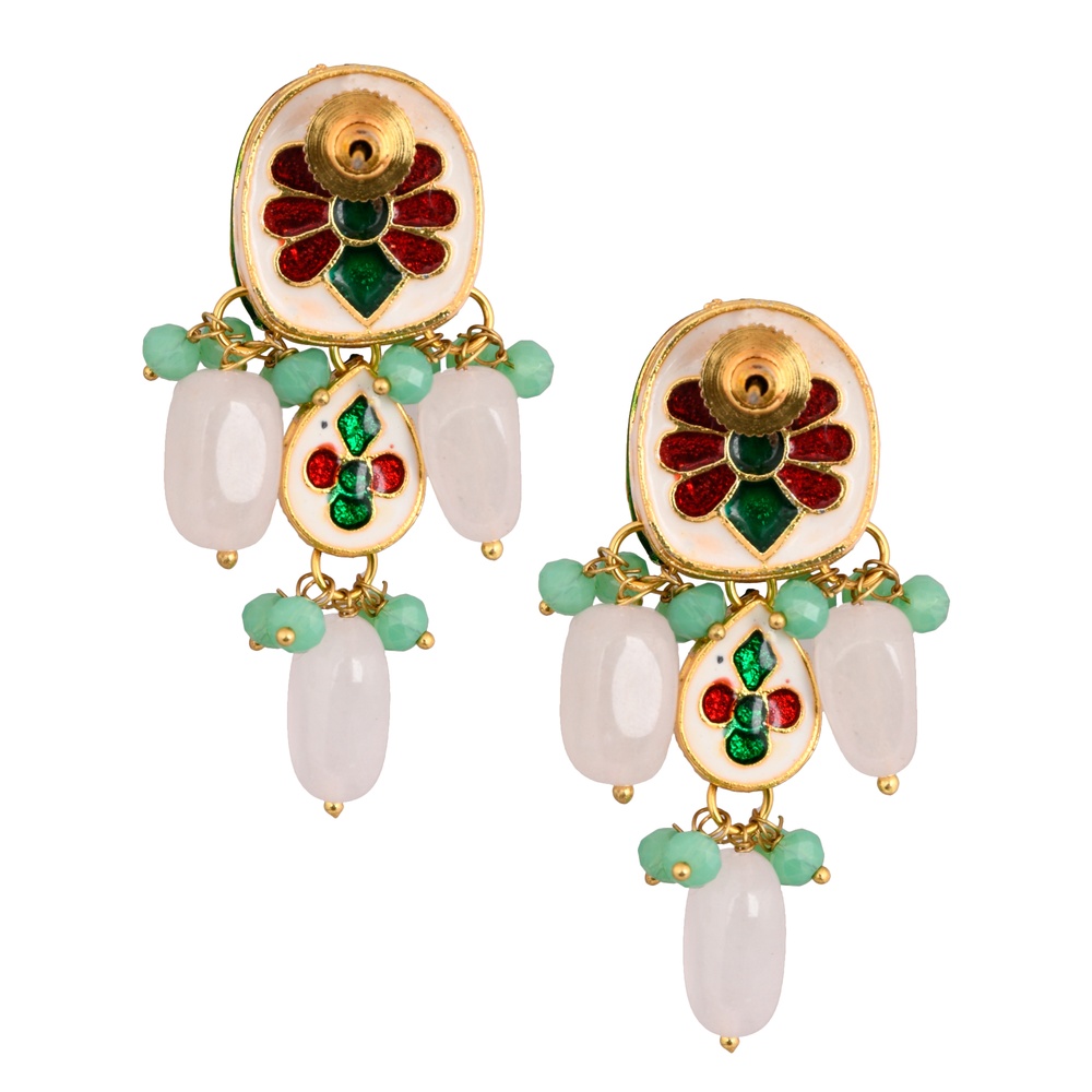 These earrings are handcrafted using traditional techniques and feature a unique combination of oval and teardrop mirrors with green and white bead accents, ensuring each pair is one-of-a-kind and durable.
