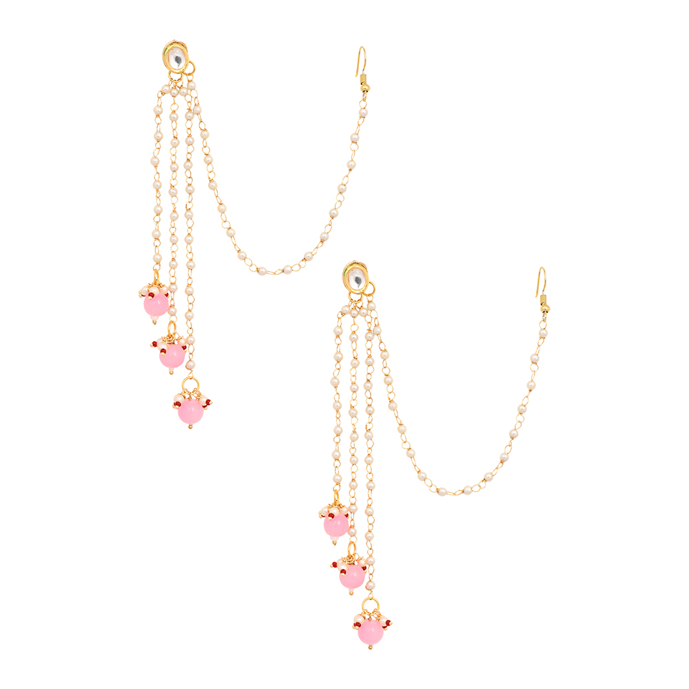The Mirror & Pearl Ear Chain Earrings with Pink Bead Drops Pair is crafted to create a regal, flowing silhouette along the ear. Made in brass with a radiant gold-tone finish, these 4.50-inch earrings combine delicate mirror elements with luminous pearl highlights. Soft pink bead drops complete the design, adding movement and feminine charm. Designed for festive occasions, they bring together traditional detailing and dramatic ear chain styling.