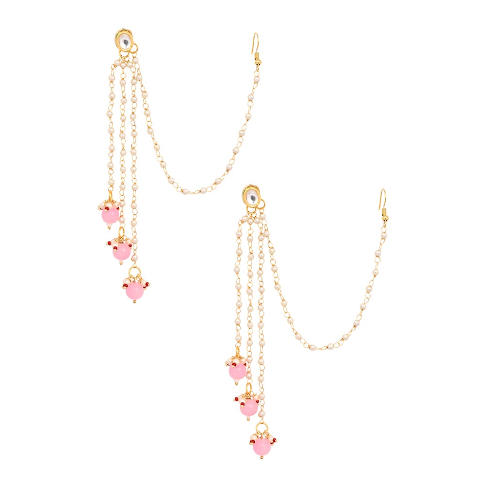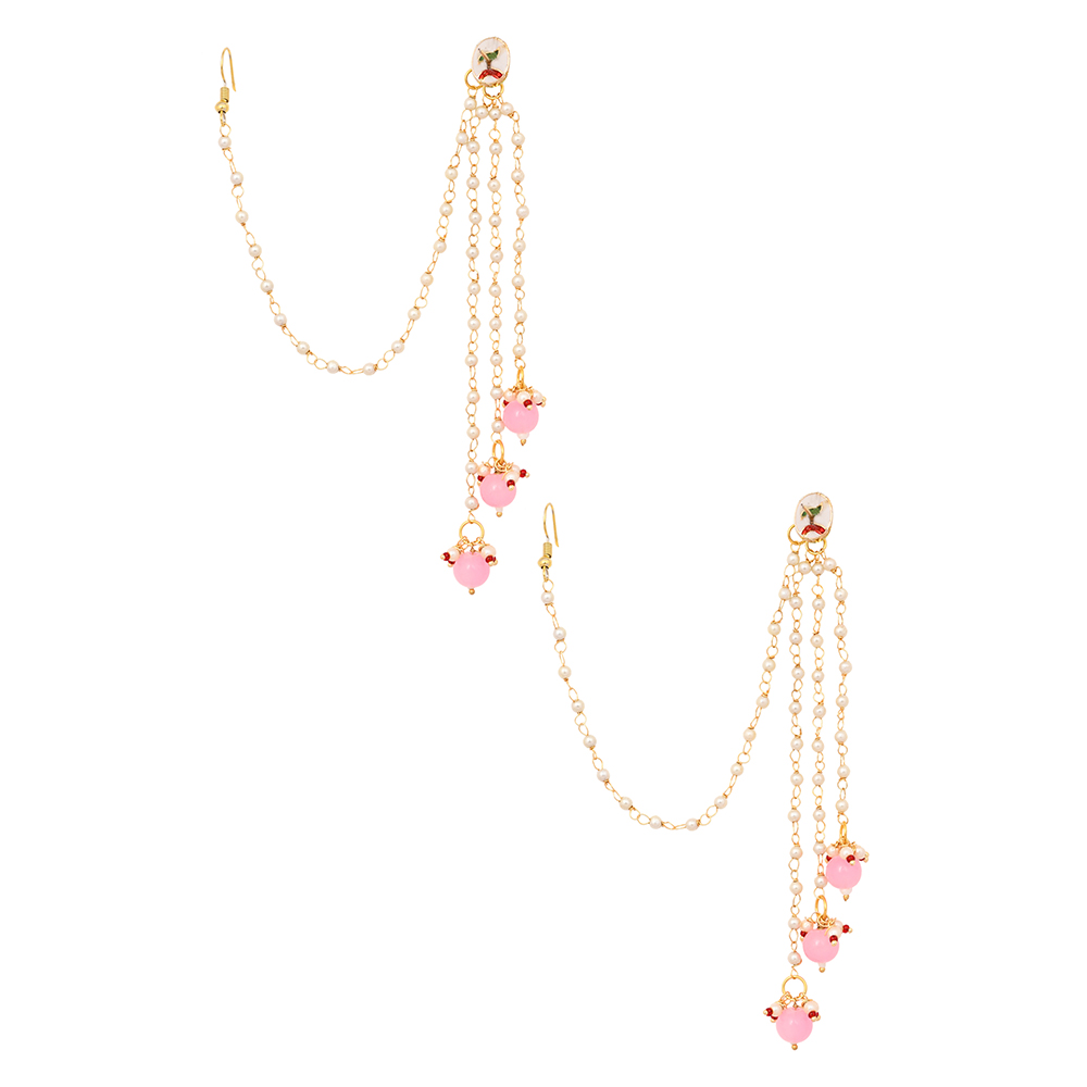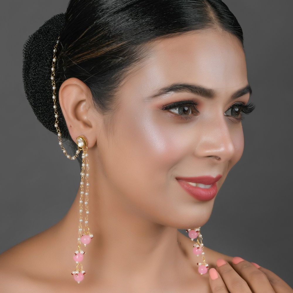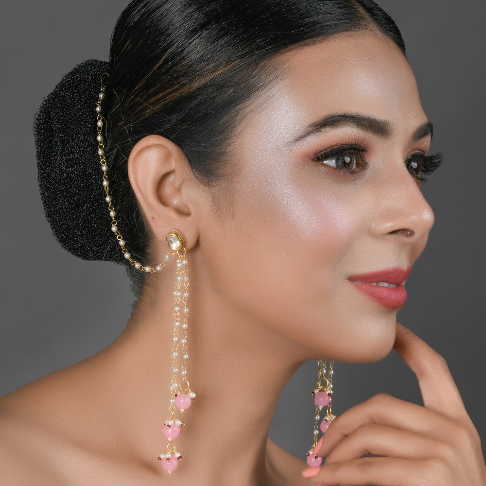 These ear-chain earrings blend mirror stones, pearl chains, and pink bead drops to create a refined yet eye-catching accessory that complements traditional and contemporary ensembles.
